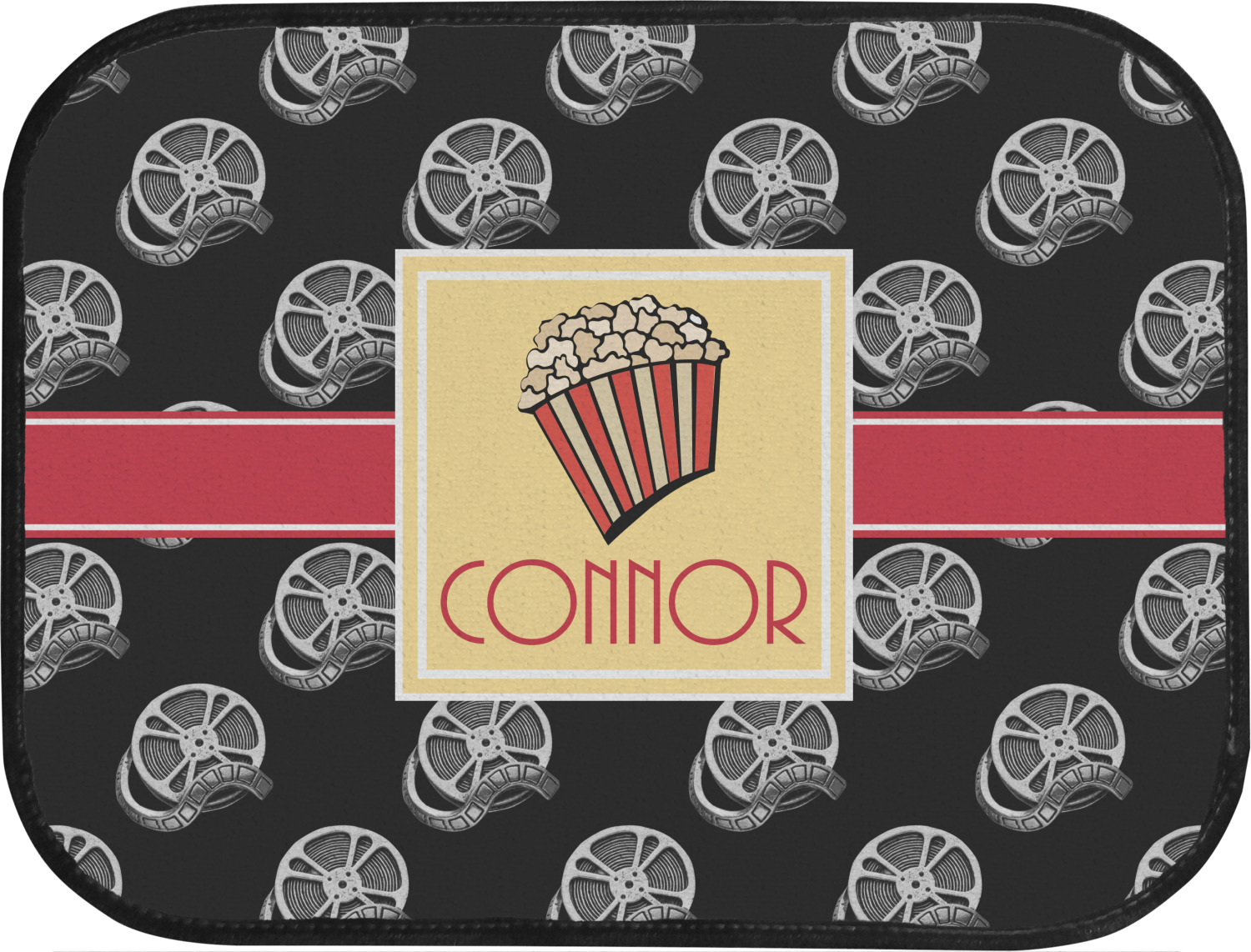This fun design features a black background with movie reels repeating. On top there is a bright red ribbon with a soft yellow frame. In the frame there is a fun popcorn graphic with your personalization underneath. The yellow and red give the perfect contrast against the dark black. The font even gives you a classic movie feel.