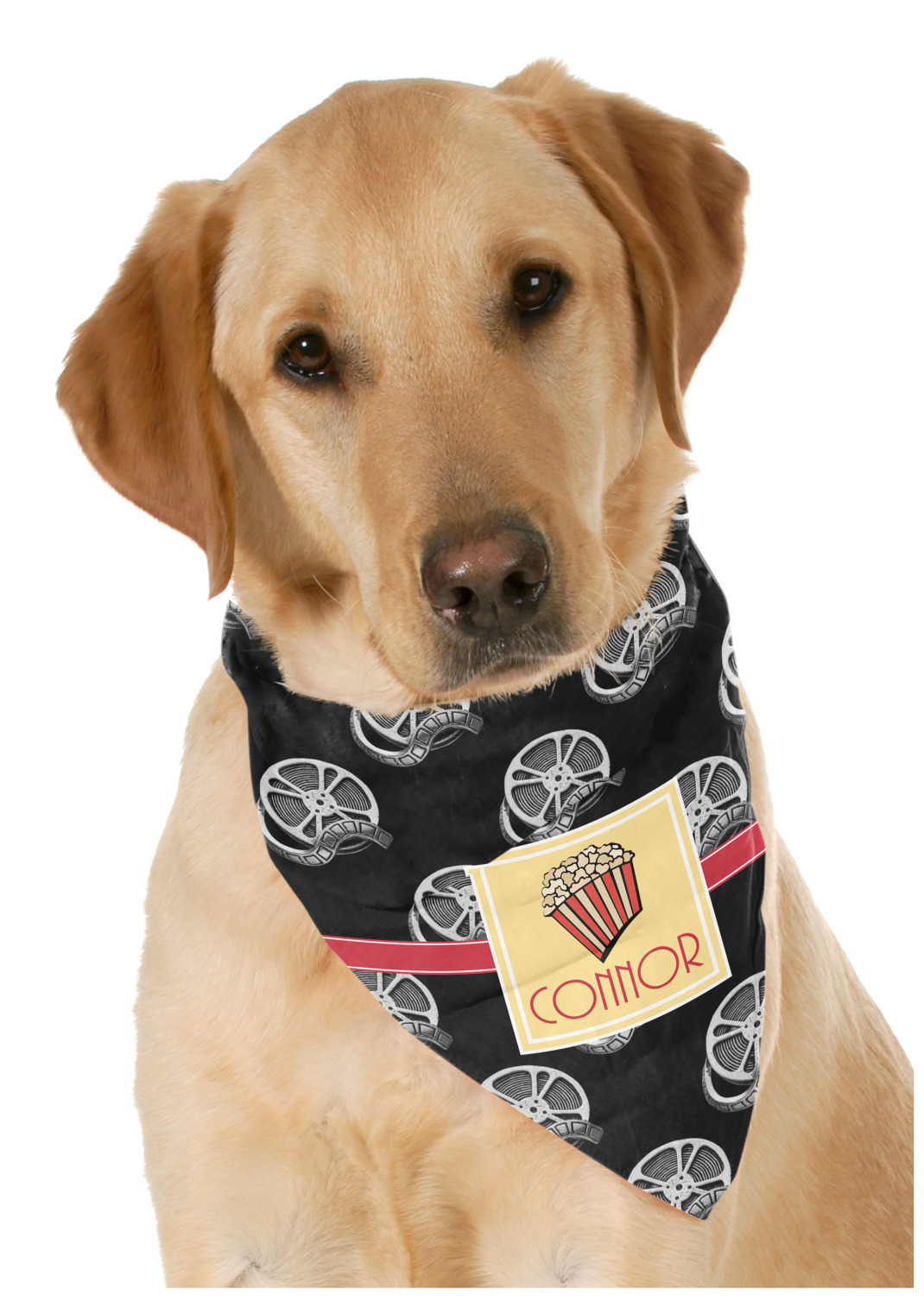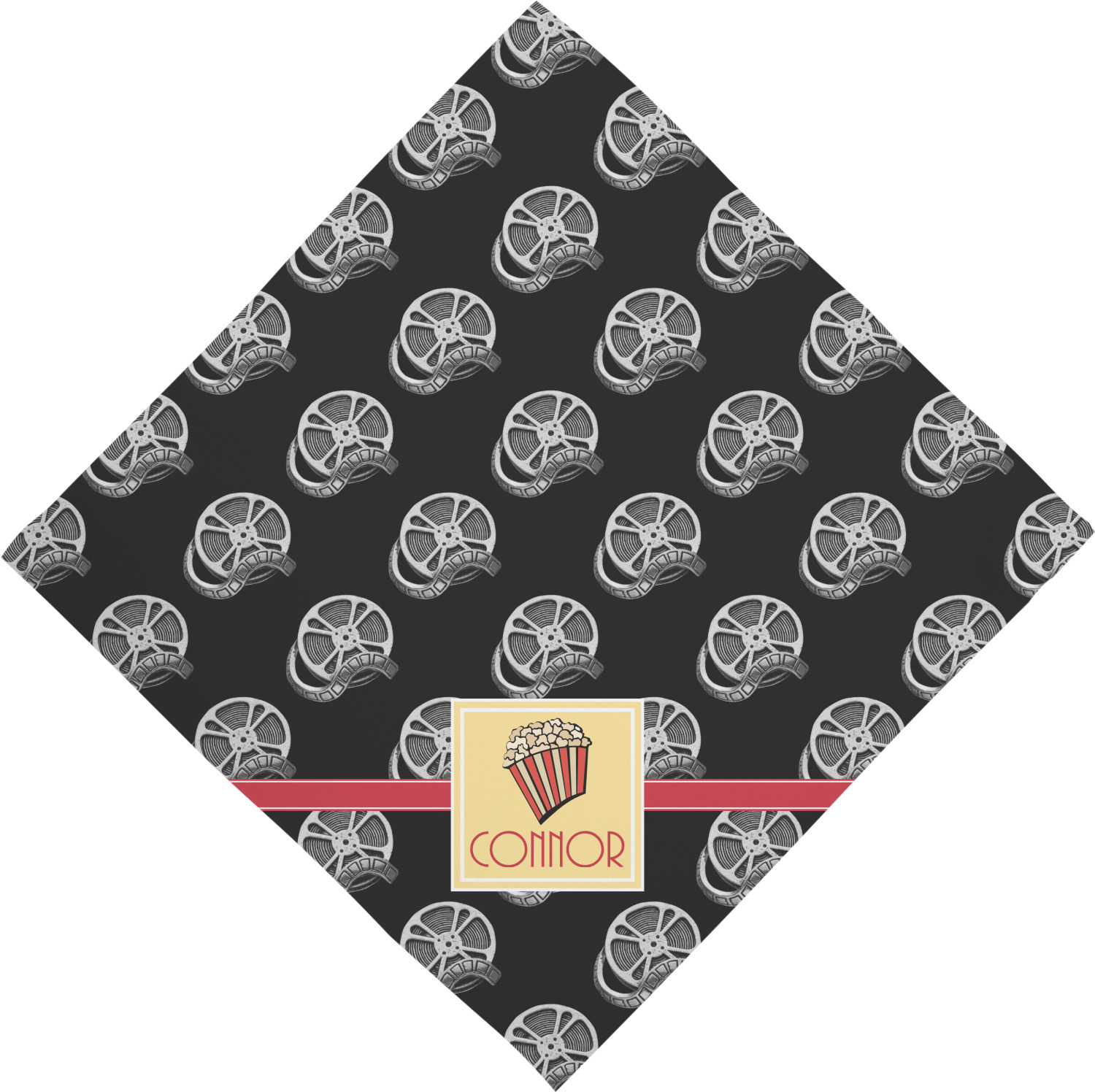 This fun design features a black background with movie reels repeating. On top there is a bright red ribbon with a soft yellow frame. In the frame there is a fun popcorn graphic with your personalization underneath. The yellow and red give the perfect contrast against the dark black. The font even gives you a classic movie feel.