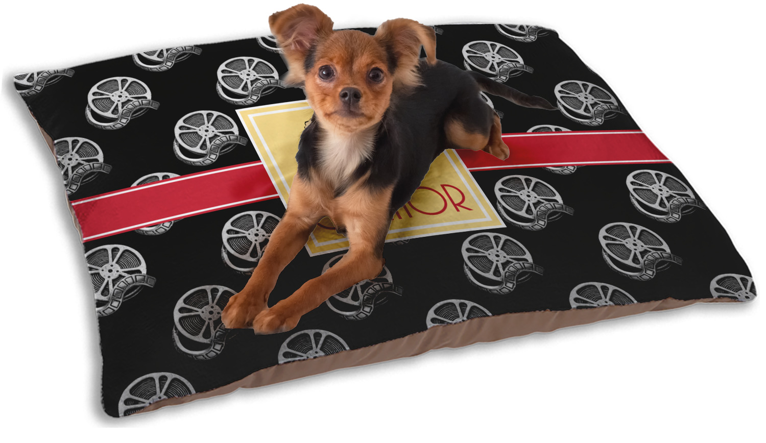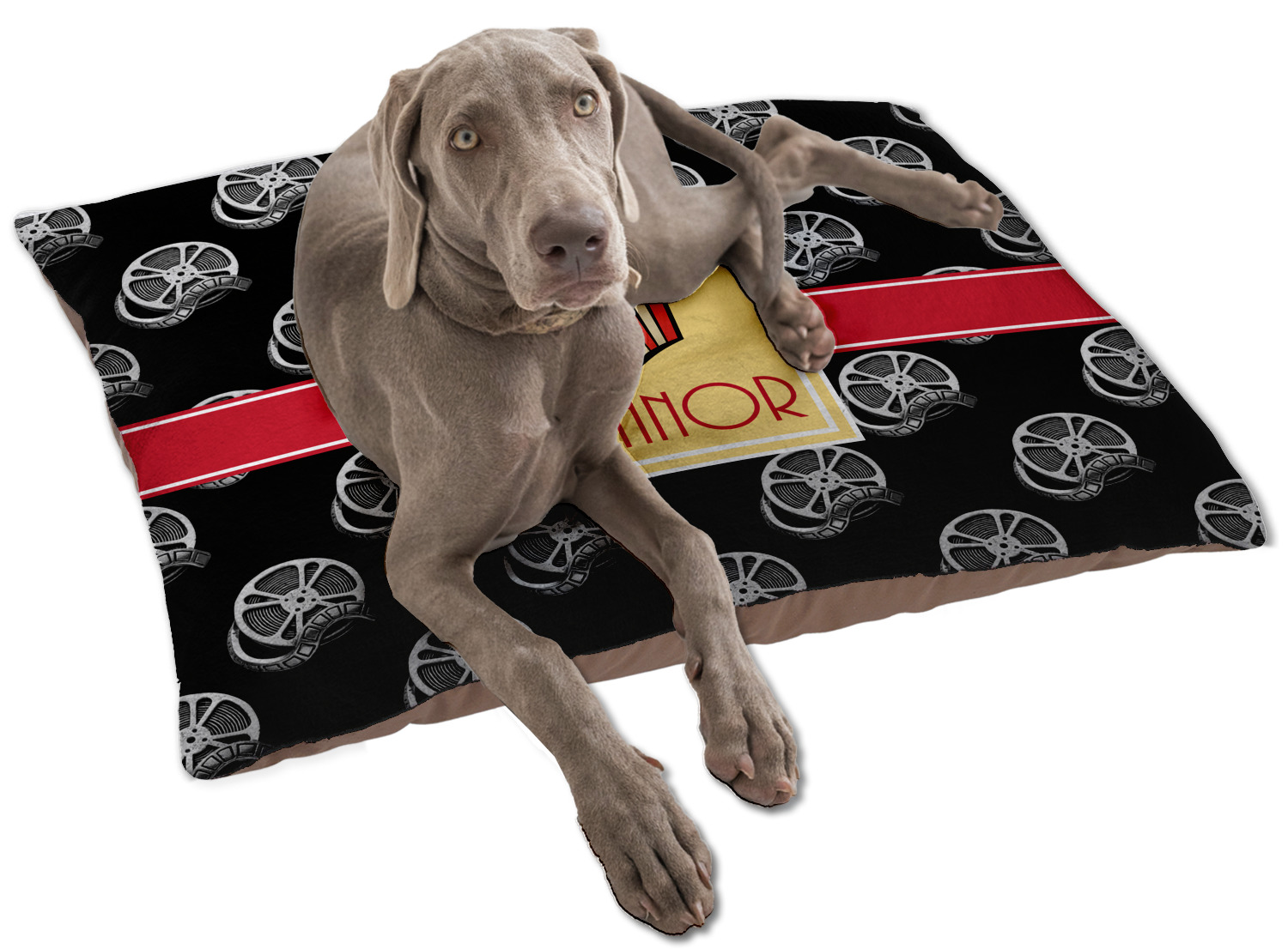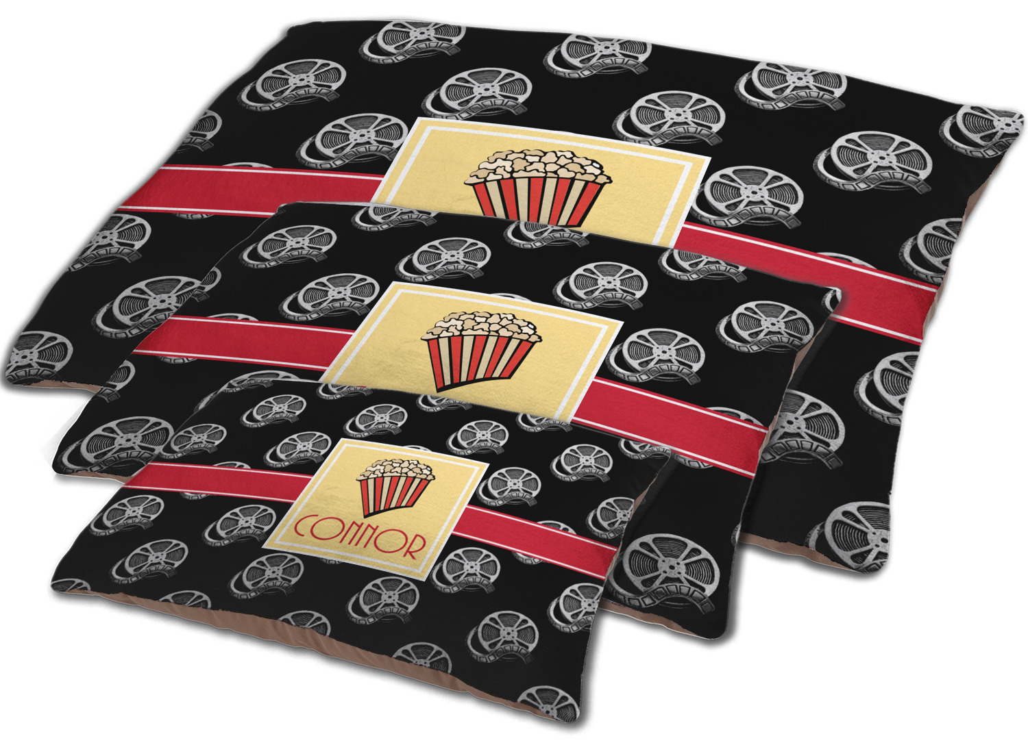 This fun design features a black background with movie reels repeating. On top there is a bright red ribbon with a soft yellow frame. In the frame there is a fun popcorn graphic with your personalization underneath. The yellow and red give the perfect contrast against the dark black. The font even gives you a classic movie feel.
