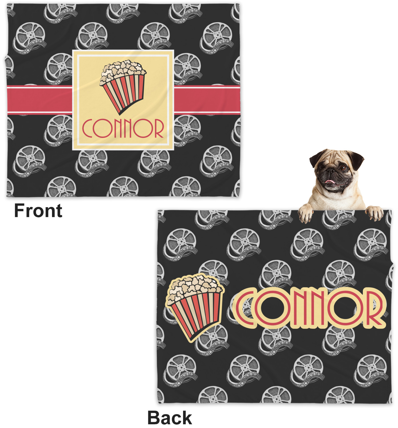This fun design features a black background with movie reels repeating. On top there is a bright red ribbon with a soft yellow frame. In the frame there is a fun popcorn graphic with your personalization underneath. The yellow and red give the perfect contrast against the dark black. The font even gives you a classic movie feel.