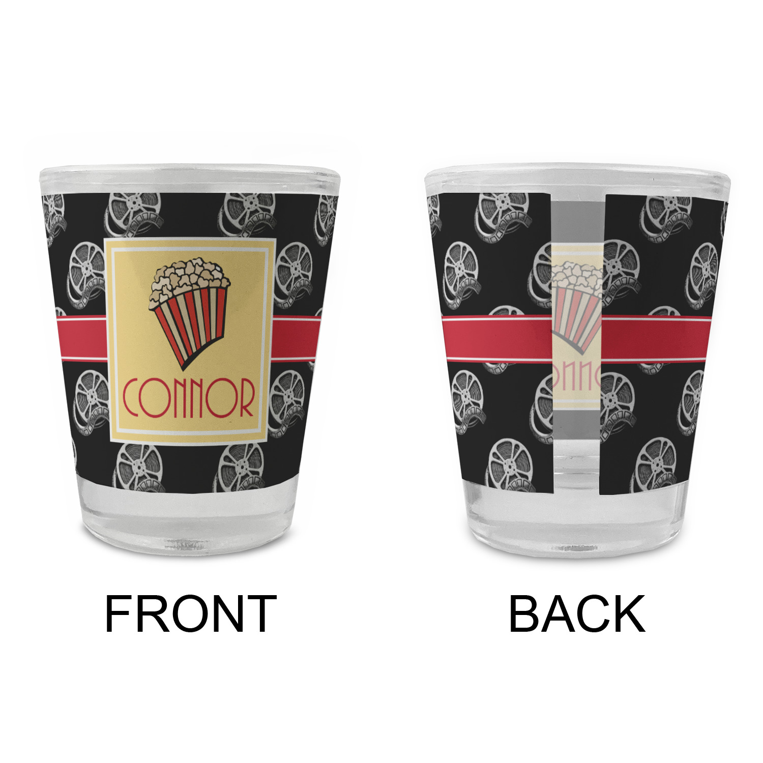 This fun design features a black background with movie reels repeating. On top there is a bright red ribbon with a soft yellow frame. In the frame there is a fun popcorn graphic with your personalization underneath. The yellow and red give the perfect contrast against the dark black. The font even gives you a classic movie feel.
