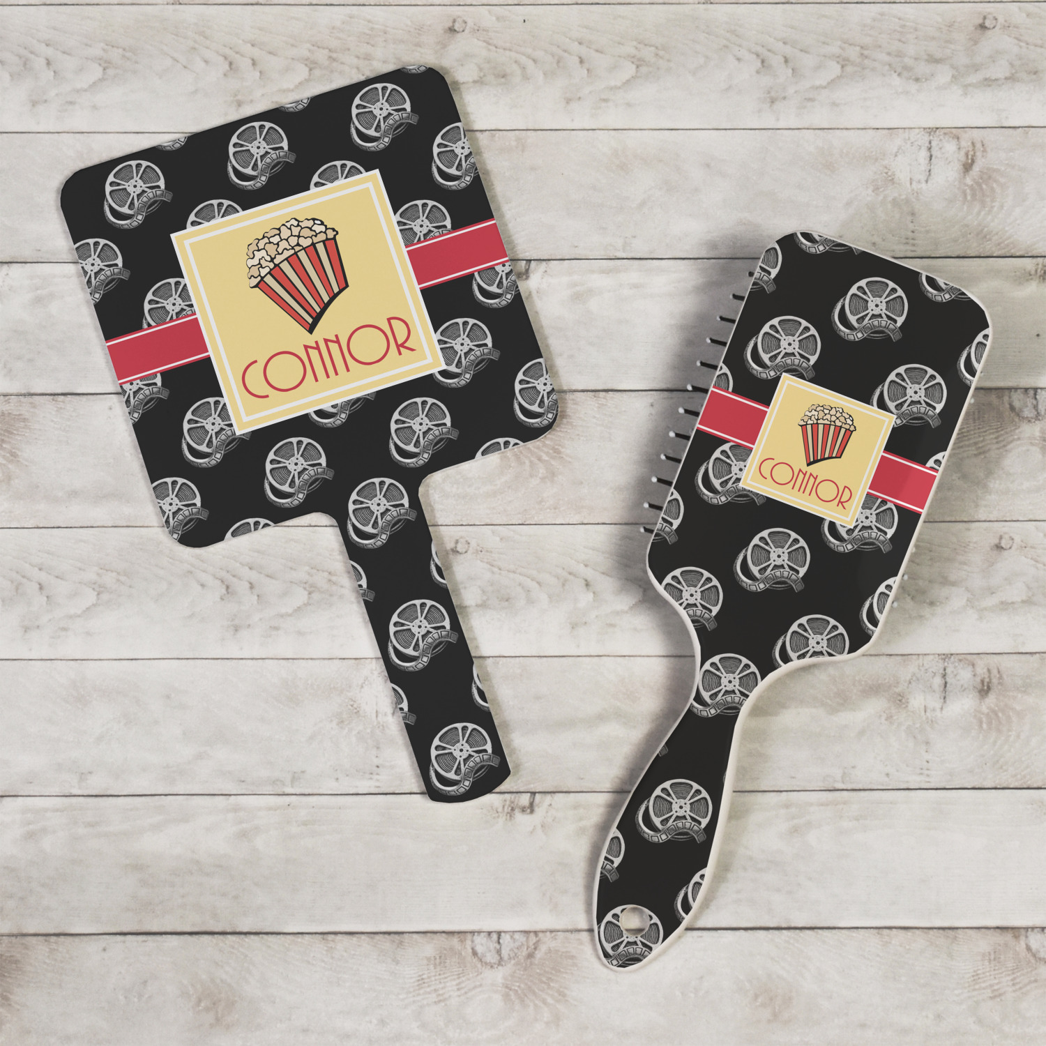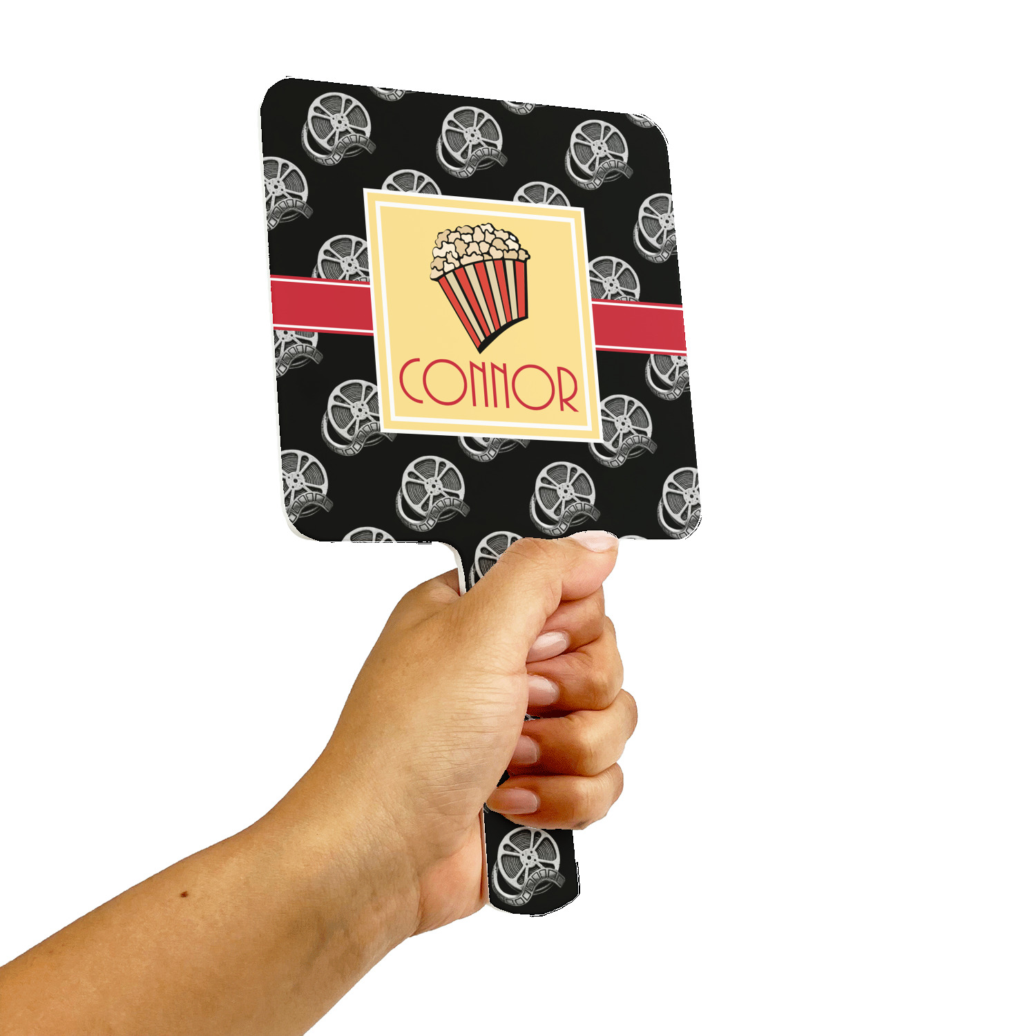This fun design features a black background with movie reels repeating. On top there is a bright red ribbon with a soft yellow frame. In the frame there is a fun popcorn graphic with your personalization underneath. The yellow and red give the perfect contrast against the dark black. The font even gives you a classic movie feel.