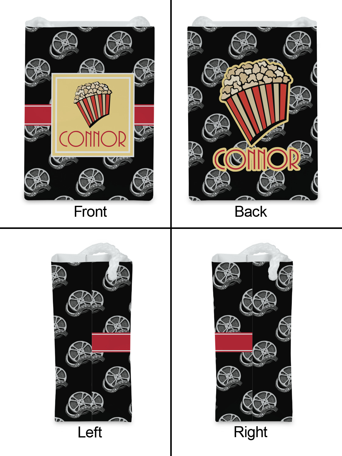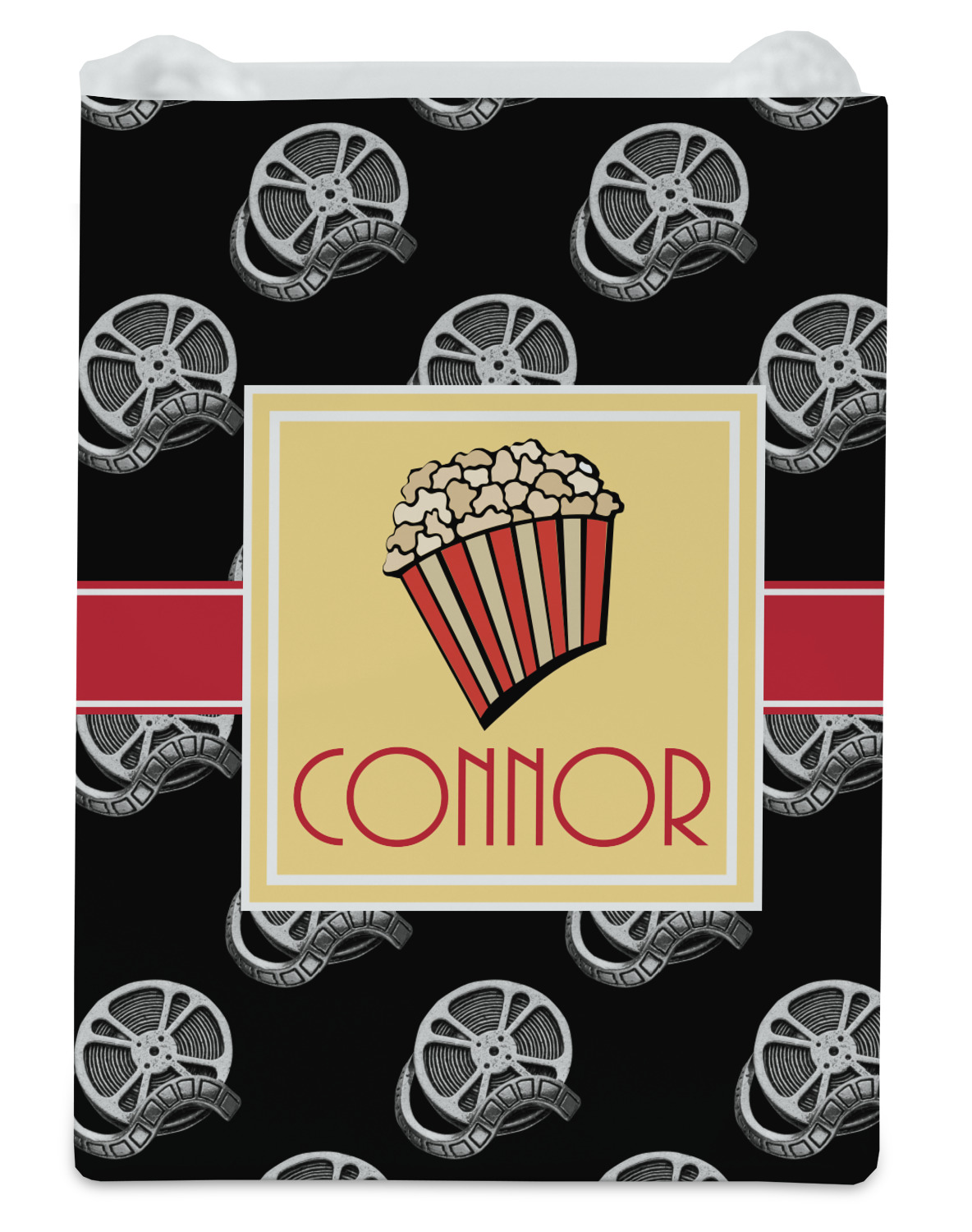 This fun design features a black background with movie reels repeating. On top there is a bright red ribbon with a soft yellow frame. In the frame there is a fun popcorn graphic with your personalization underneath. The yellow and red give the perfect contrast against the dark black. The font even gives you a classic movie feel.