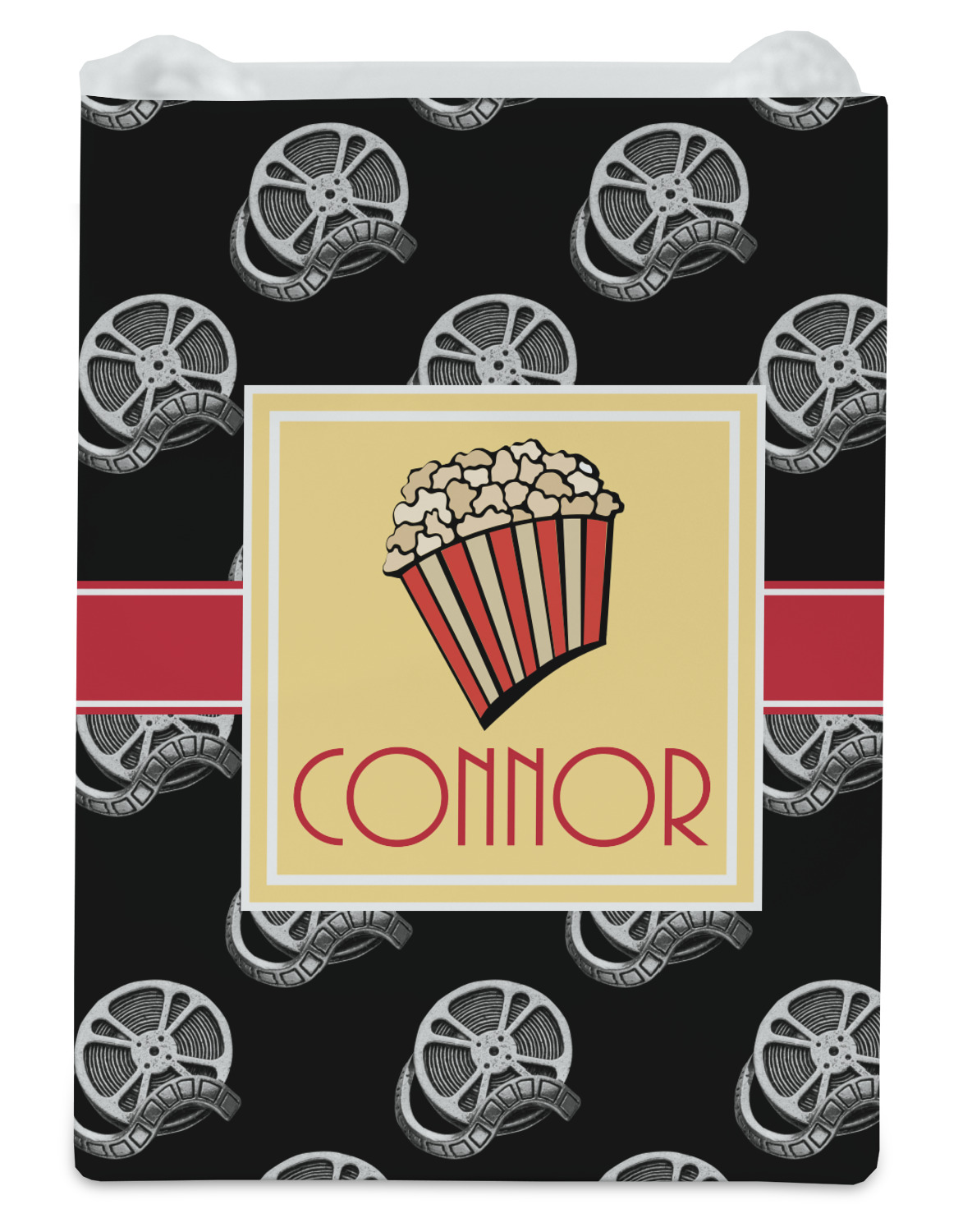 This fun design features a black background with movie reels repeating. On top there is a bright red ribbon with a soft yellow frame. In the frame there is a fun popcorn graphic with your personalization underneath. The yellow and red give the perfect contrast against the dark black. The font even gives you a classic movie feel.