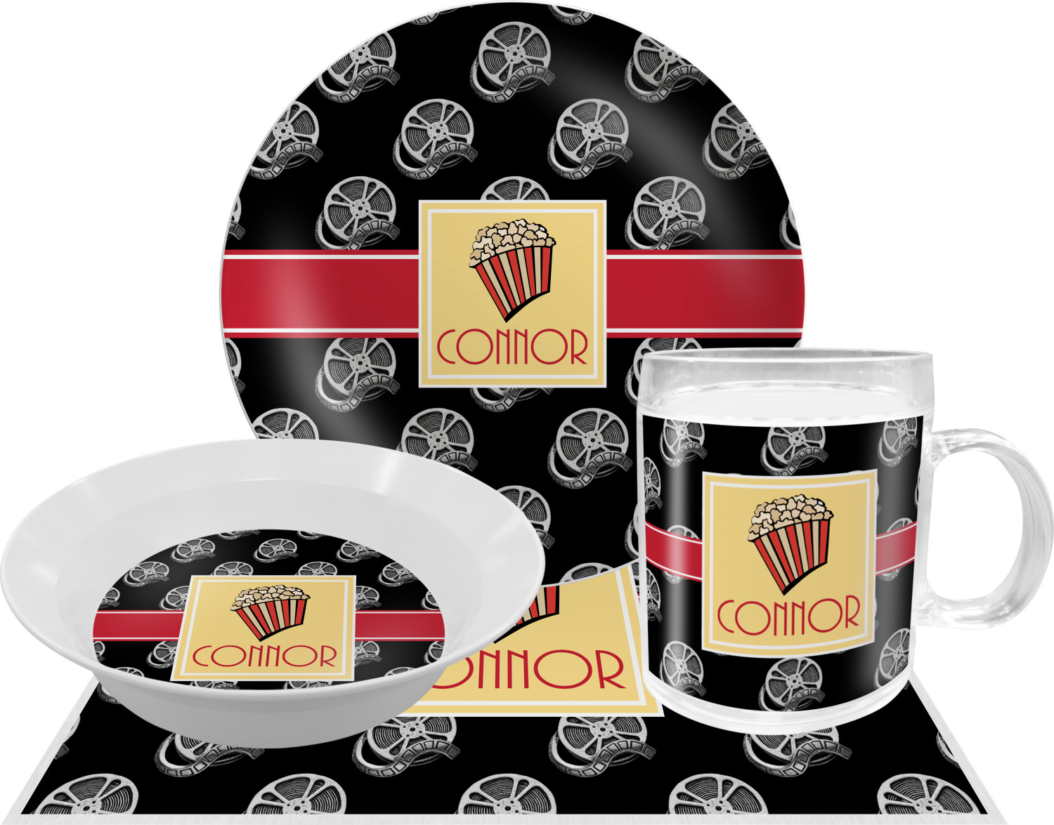 This fun design features a black background with movie reels repeating. On top there is a bright red ribbon with a soft yellow frame. In the frame there is a fun popcorn graphic with your personalization underneath. The yellow and red give the perfect contrast against the dark black. The font even gives you a classic movie feel.
