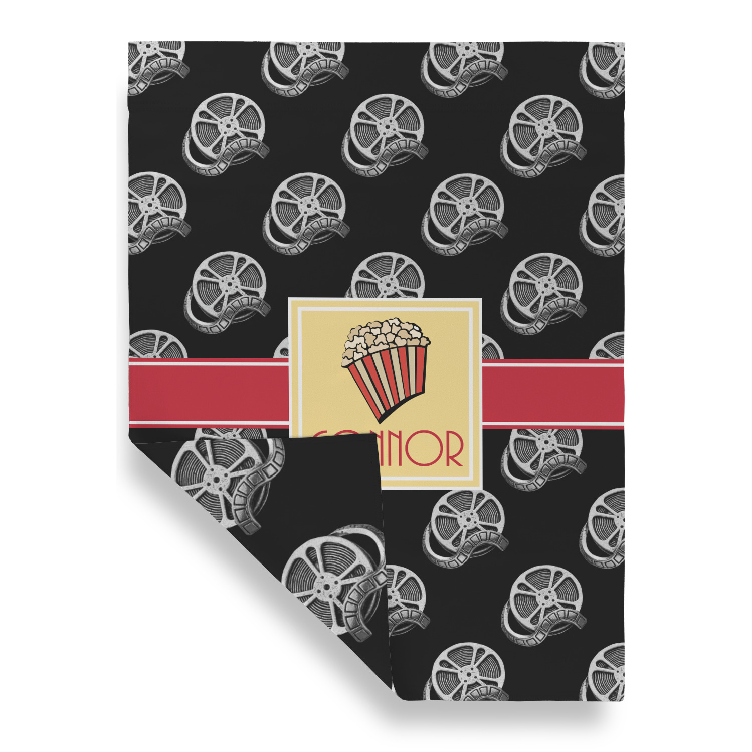 This fun design features a black background with movie reels repeating. On top there is a bright red ribbon with a soft yellow frame. In the frame there is a fun popcorn graphic with your personalization underneath. The yellow and red give the perfect contrast against the dark black. The font even gives you a classic movie feel.