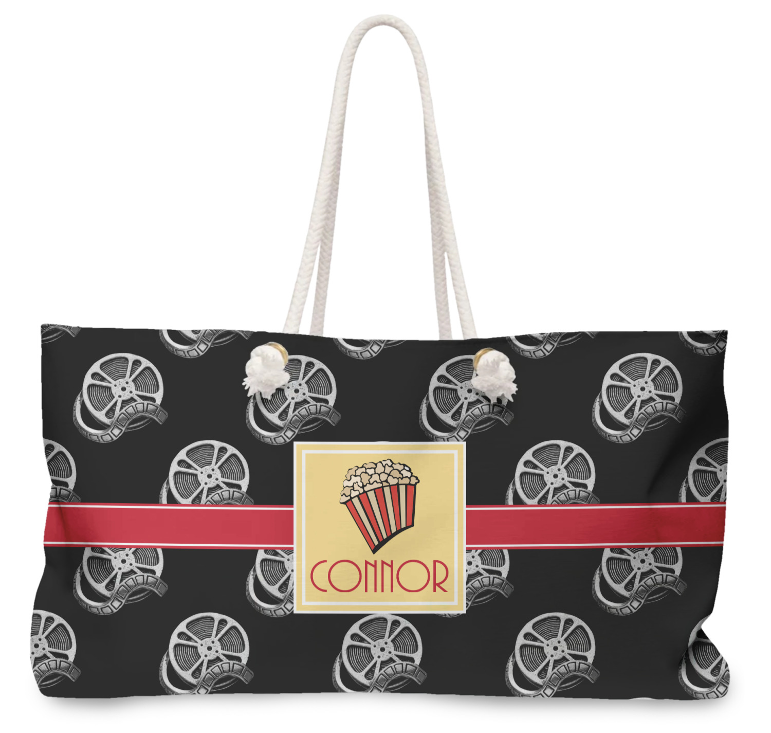 This fun design features a black background with movie reels repeating. On top there is a bright red ribbon with a soft yellow frame. In the frame there is a fun popcorn graphic with your personalization underneath. The yellow and red give the perfect contrast against the dark black. The font even gives you a classic movie feel.