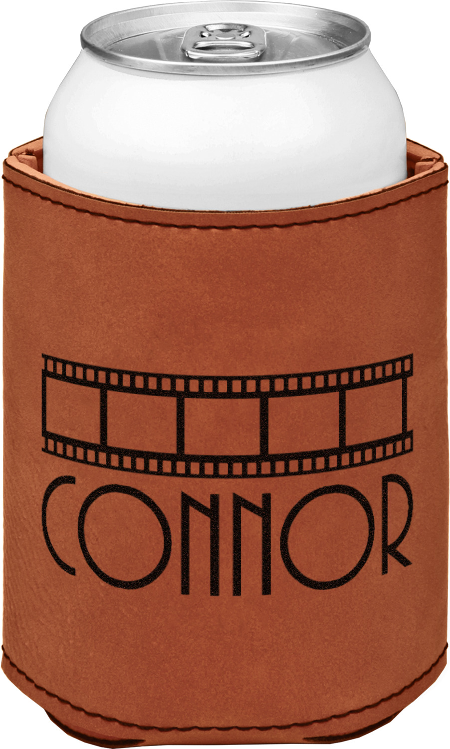 This can sleeve is made from a cognac-brown leatherette and stitched with a sturdy, black thread. A slim padding lines the inside of your can sleeve to allow for a better fit once your drink is inserted. The sleeve itself measures at 4 by 4.5 inches, allowing this custom can sleeve to accommodate most canned drinks. Your personalized design can be engraved on the front and back, or solely the front. When laser-engraved, your design appears as a black coloration which contrasts the leatherette nicely.