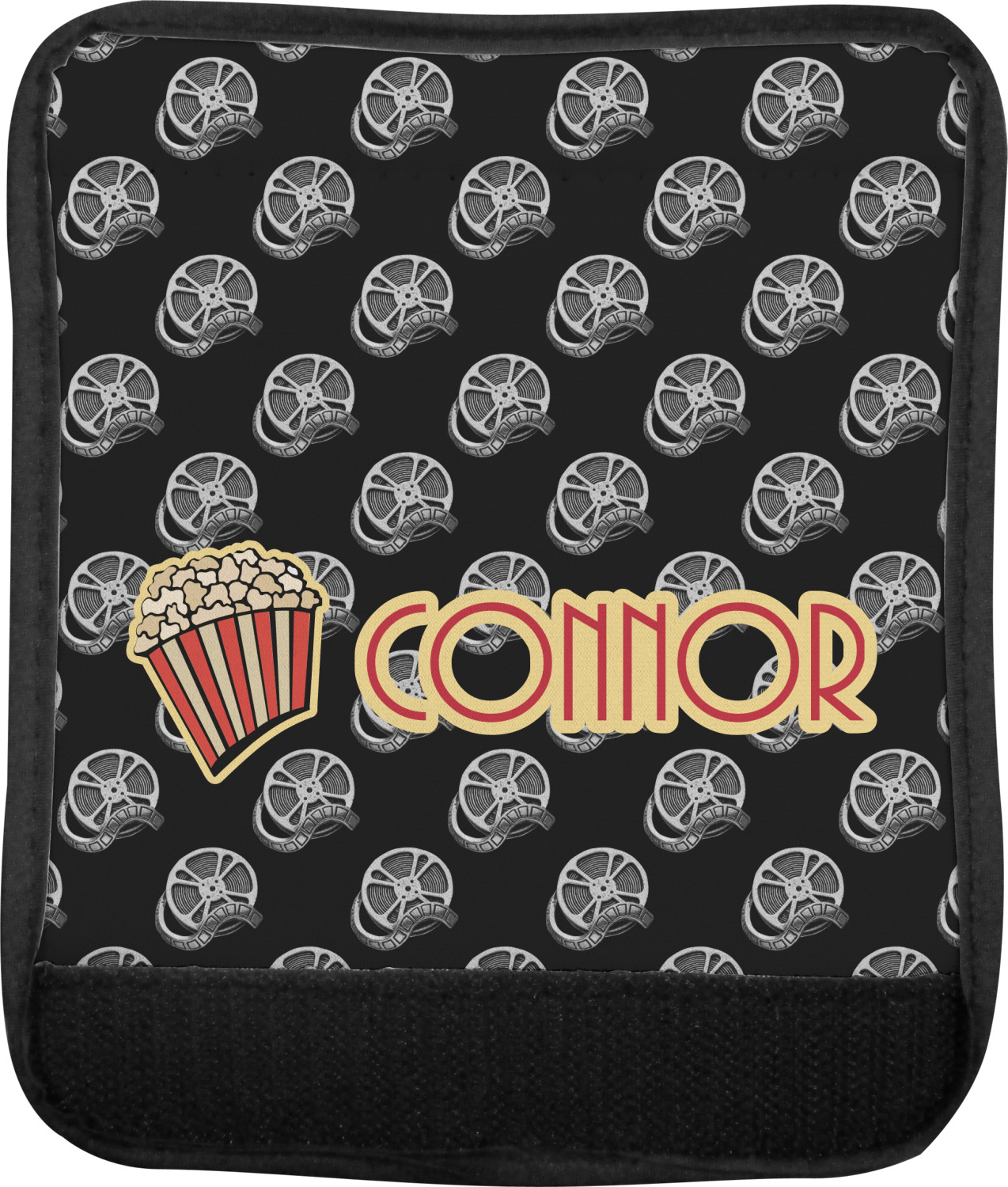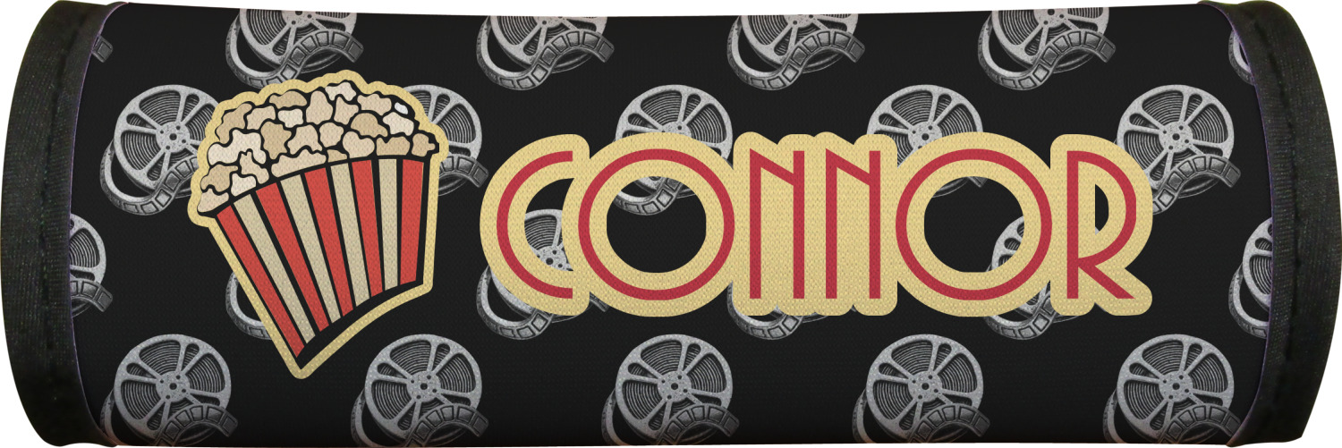 This fun design features a black background with movie reels repeating. On top there is a bright red ribbon with a soft yellow frame. In the frame there is a fun popcorn graphic with your personalization underneath. The yellow and red give the perfect contrast against the dark black. The font even gives you a classic movie feel.