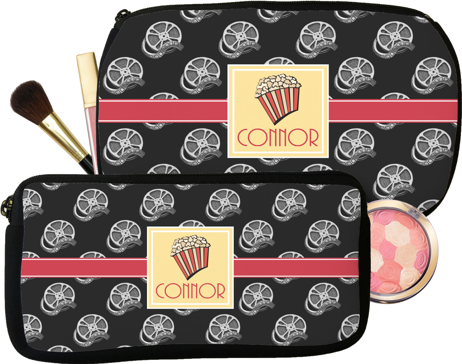 Our personalized makeup bags are available in many different designs, patterns and colors - so you are sure to find one that will love. They are made of neoprene (same material as wet-suits) and thus are water resistant, so spillages in your makeup bag will not end up all over you purse. They are customized on one side and are black on the other side and the zipper is black as well.