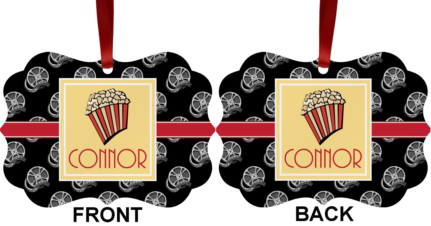 This fun design features a black background with movie reels repeating. On top there is a bright red ribbon with a soft yellow frame. In the frame there is a fun popcorn graphic with your personalization underneath. The yellow and red give the perfect contrast against the dark black. The font even gives you a classic movie feel.