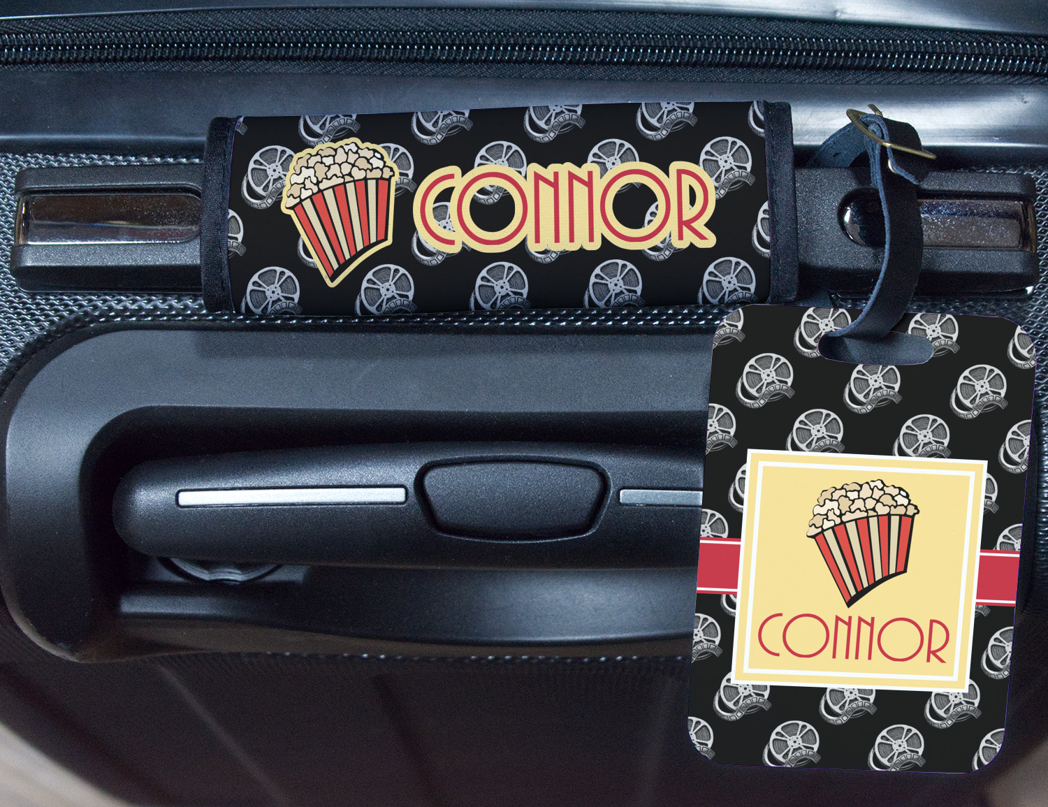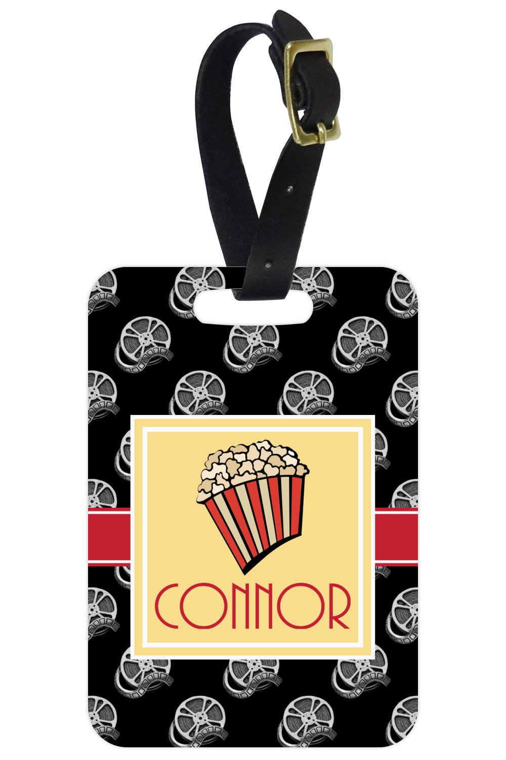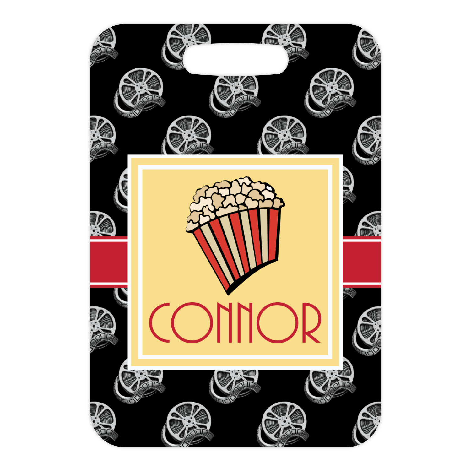 This fun design features a black background with movie reels repeating. On top there is a bright red ribbon with a soft yellow frame. In the frame there is a fun popcorn graphic with your personalization underneath. The yellow and red give the perfect contrast against the dark black. The font even gives you a classic movie feel.