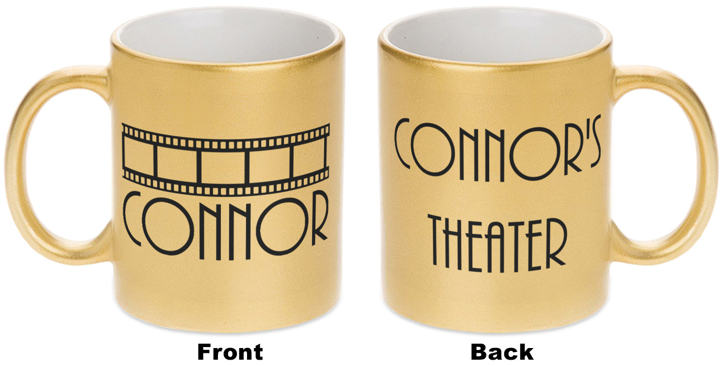 Our custom mugs are ceramic, which is great for keeping your tea or coffee warm! We offer two metallic mugs to personalize - Silver or Gold. Both styles hold around 11oz and have dimensions of approximately 3.75" x 3.5" x 4.75". Both the metallic mugs come in a matte finish and have glitter detailing to add a more pristine feel to the gold and silver base colors.