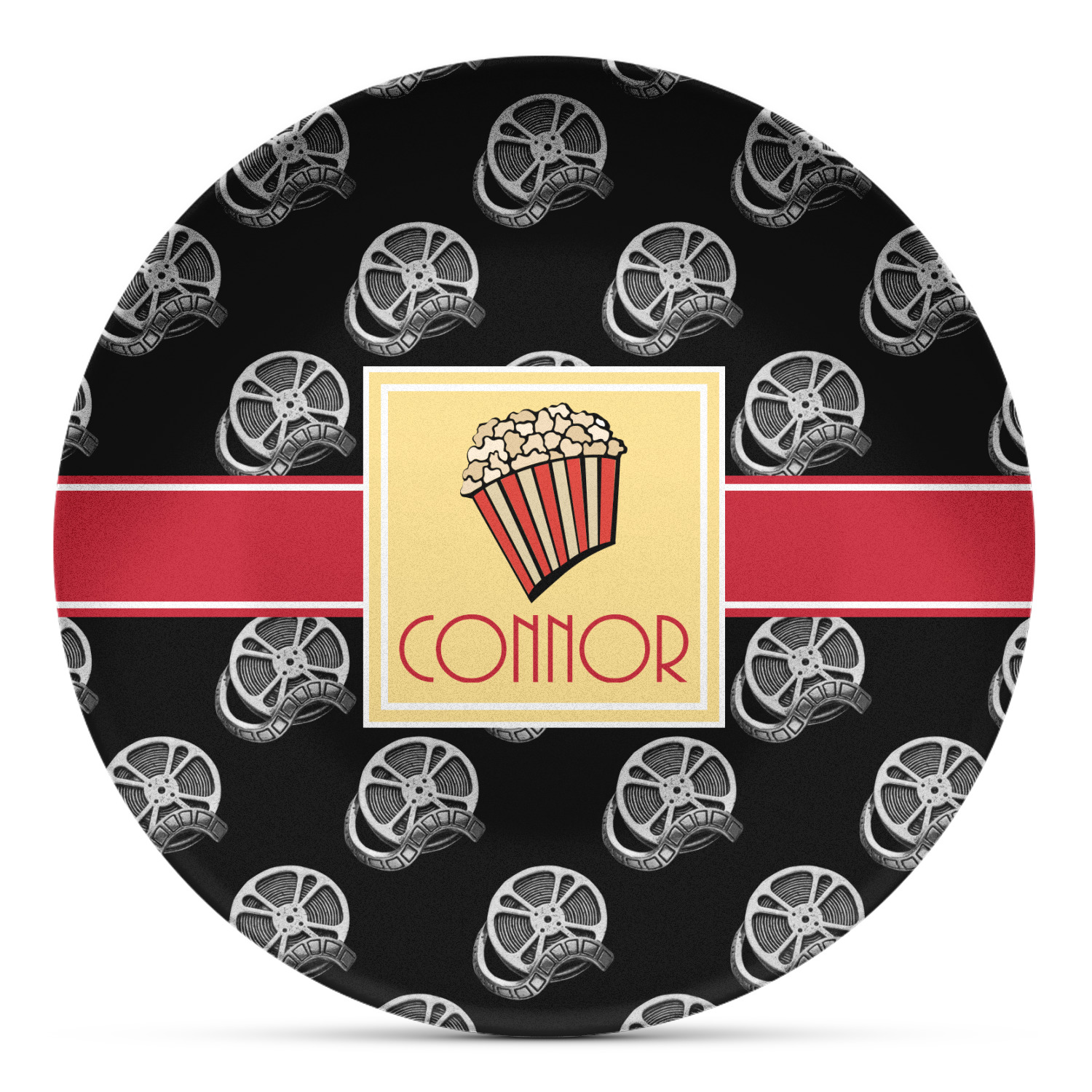 This fun design features a black background with movie reels repeating. On top there is a bright red ribbon with a soft yellow frame. In the frame there is a fun popcorn graphic with your personalization underneath. The yellow and red give the perfect contrast against the dark black. The font even gives you a classic movie feel.