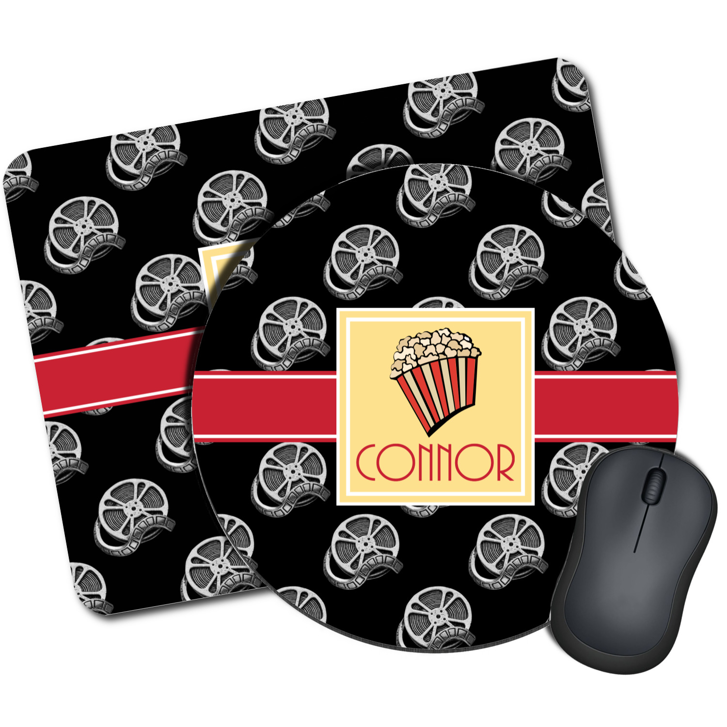 This fun design features a black background with movie reels repeating. On top there is a bright red ribbon with a soft yellow frame. In the frame there is a fun popcorn graphic with your personalization underneath. The yellow and red give the perfect contrast against the dark black. The font even gives you a classic movie feel.