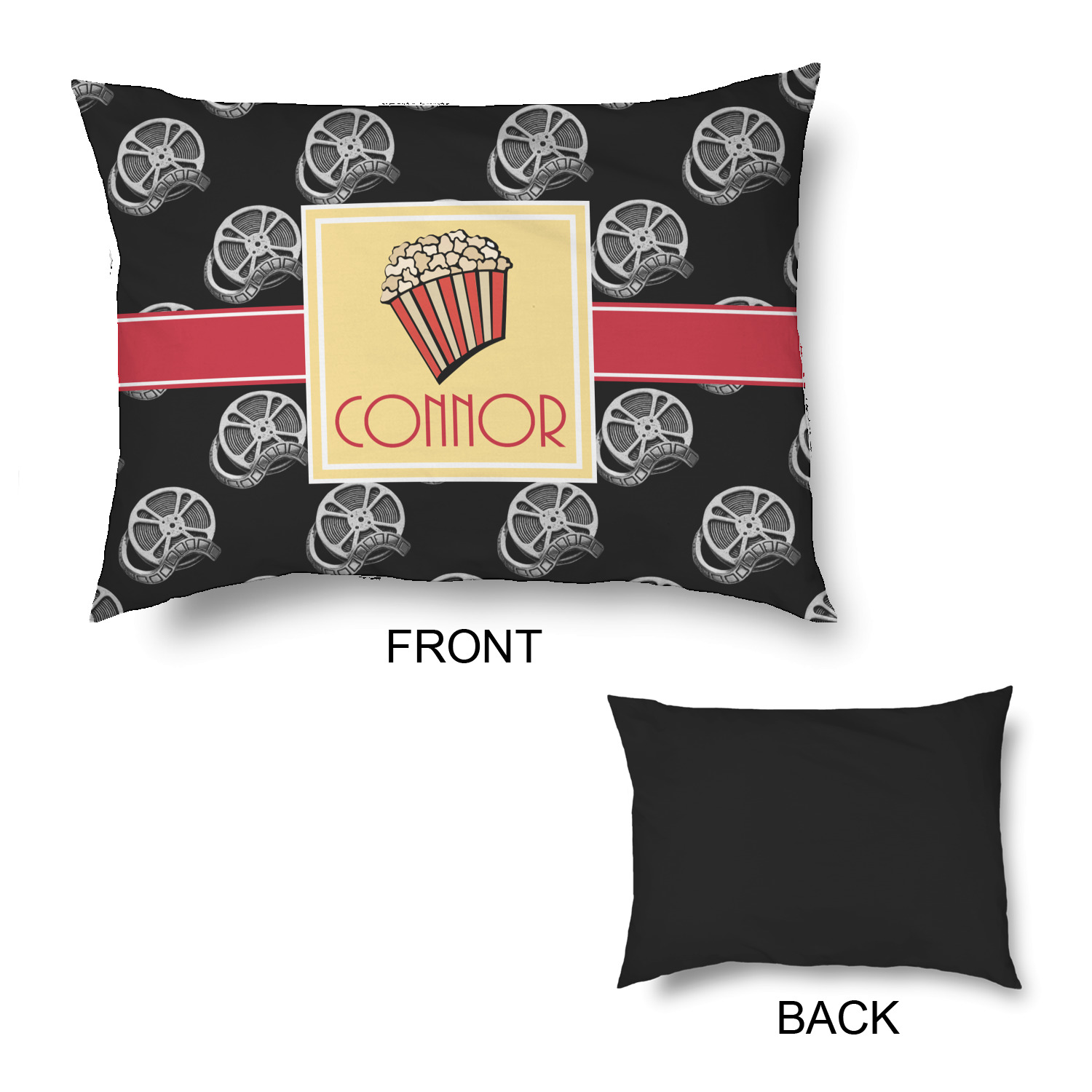 This fun design features a black background with movie reels repeating. On top there is a bright red ribbon with a soft yellow frame. In the frame there is a fun popcorn graphic with your personalization underneath. The yellow and red give the perfect contrast against the dark black. The font even gives you a classic movie feel.