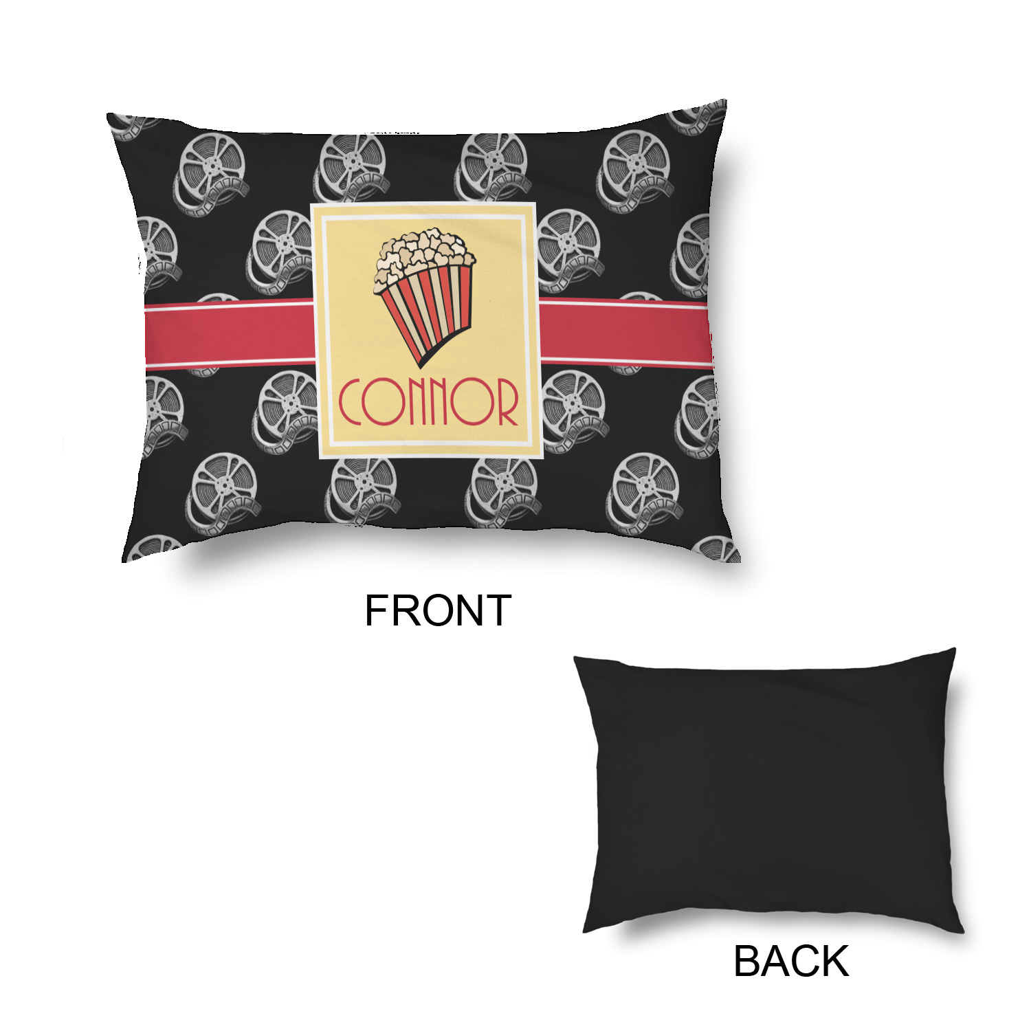 This fun design features a black background with movie reels repeating. On top there is a bright red ribbon with a soft yellow frame. In the frame there is a fun popcorn graphic with your personalization underneath. The yellow and red give the perfect contrast against the dark black. The font even gives you a classic movie feel.