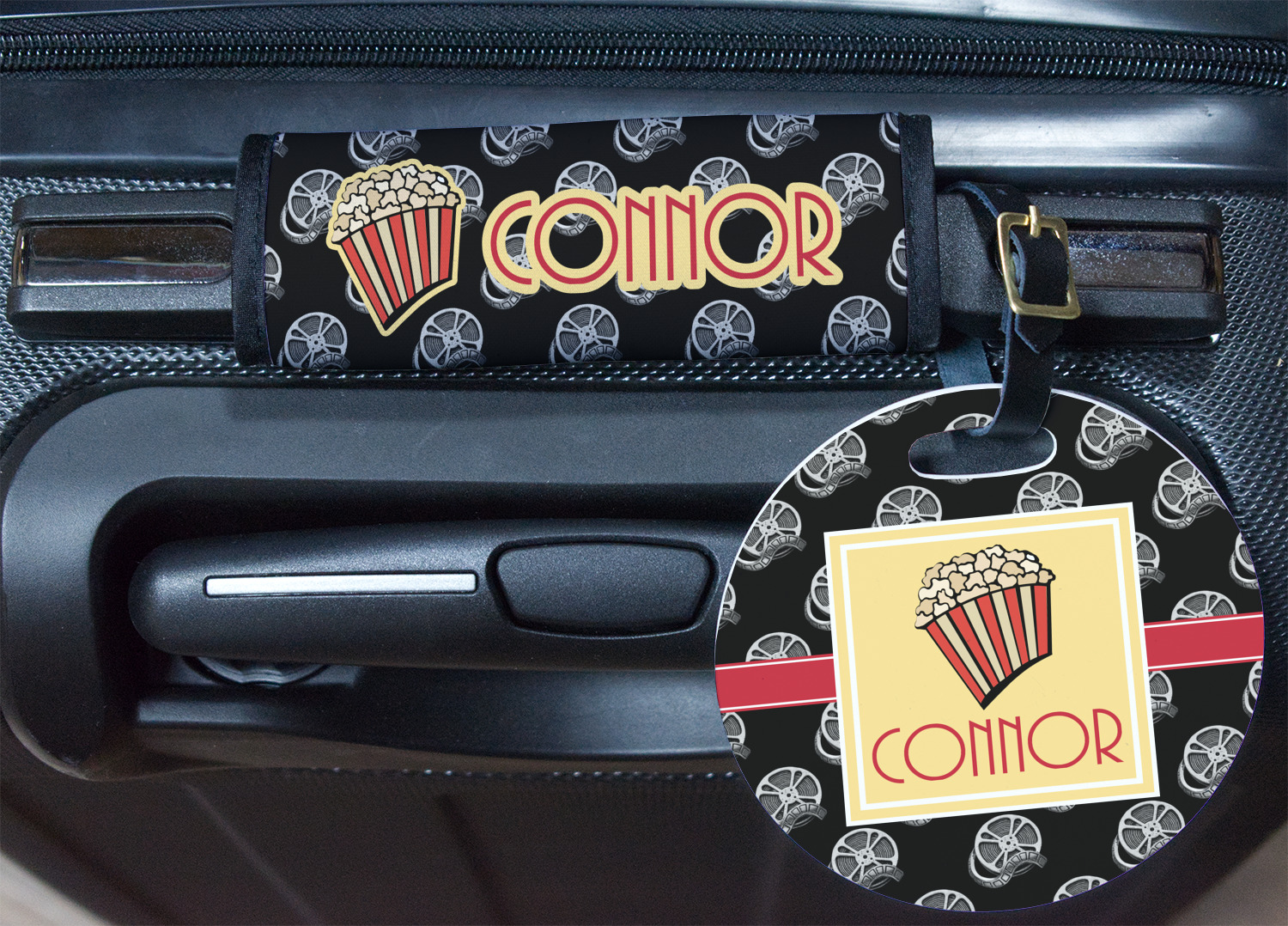 This fun design features a black background with movie reels repeating. On top there is a bright red ribbon with a soft yellow frame. In the frame there is a fun popcorn graphic with your personalization underneath. The yellow and red give the perfect contrast against the dark black. The font even gives you a classic movie feel.