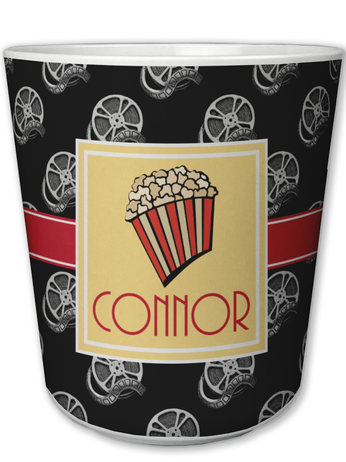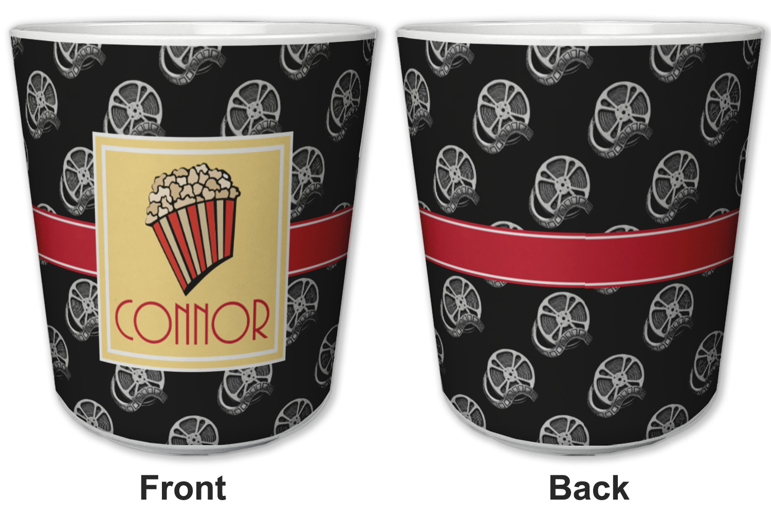This fun design features a black background with movie reels repeating. On top there is a bright red ribbon with a soft yellow frame. In the frame there is a fun popcorn graphic with your personalization underneath. The yellow and red give the perfect contrast against the dark black. The font even gives you a classic movie feel.