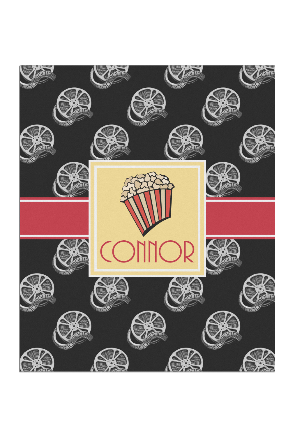 This fun design features a black background with movie reels repeating. On top there is a bright red ribbon with a soft yellow frame. In the frame there is a fun popcorn graphic with your personalization underneath. The yellow and red give the perfect contrast against the dark black. The font even gives you a classic movie feel.