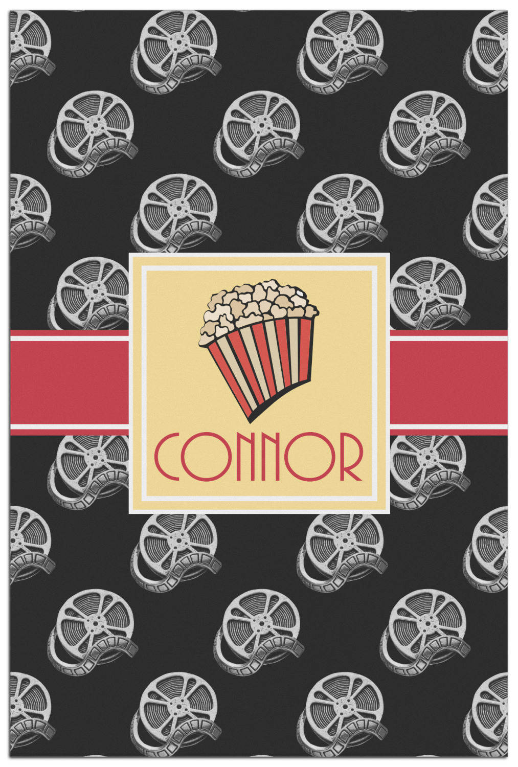 This fun design features a black background with movie reels repeating. On top there is a bright red ribbon with a soft yellow frame. In the frame there is a fun popcorn graphic with your personalization underneath. The yellow and red give the perfect contrast against the dark black. The font even gives you a classic movie feel.