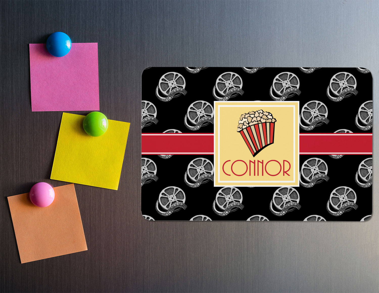 This fun design features a black background with movie reels repeating. On top there is a bright red ribbon with a soft yellow frame. In the frame there is a fun popcorn graphic with your personalization underneath. The yellow and red give the perfect contrast against the dark black. The font even gives you a classic movie feel.