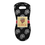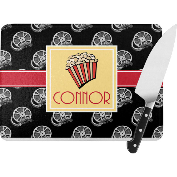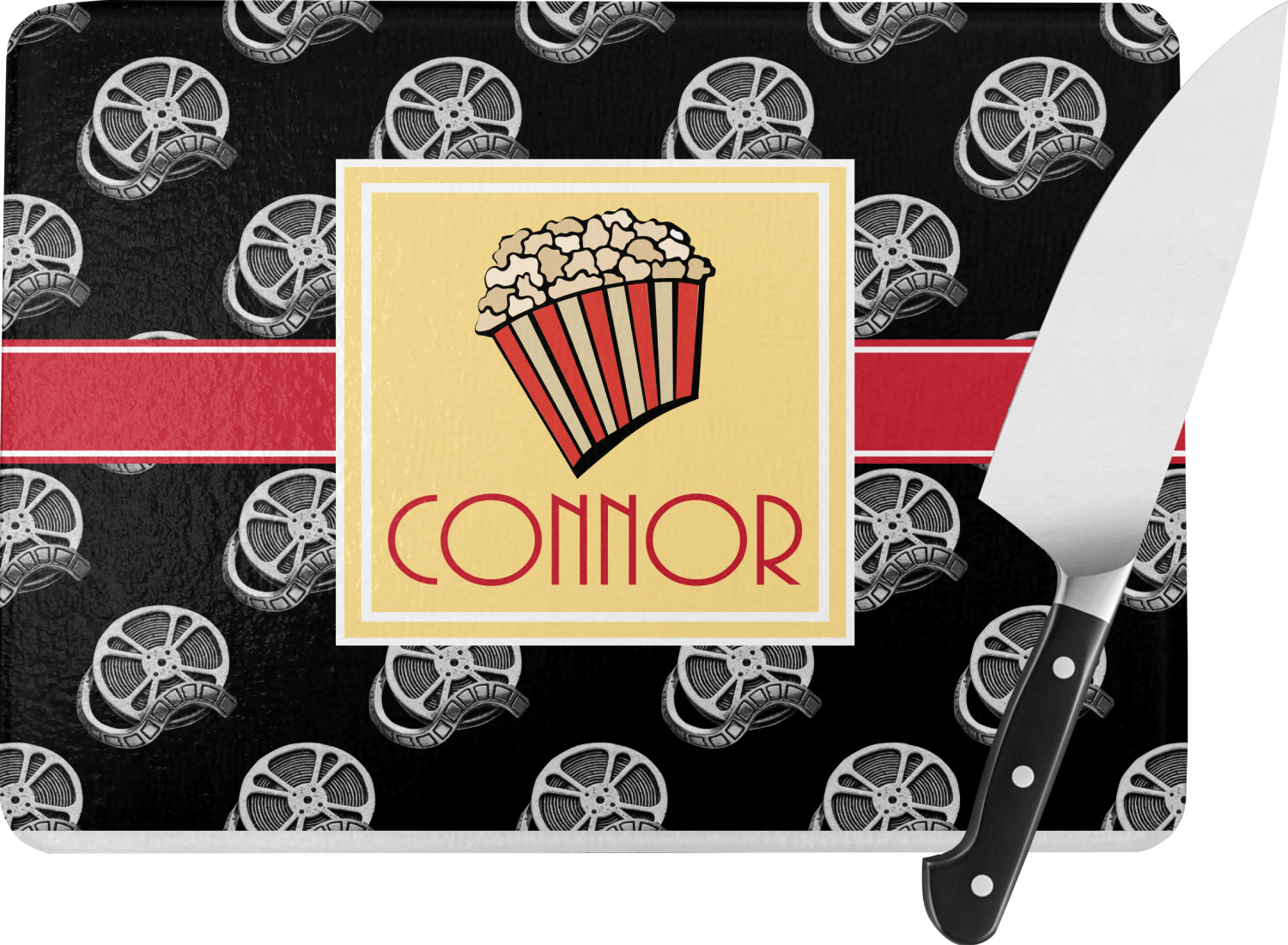 This fun design features a black background with movie reels repeating. On top there is a bright red ribbon with a soft yellow frame. In the frame there is a fun popcorn graphic with your personalization underneath. The yellow and red give the perfect contrast against the dark black. The font even gives you a classic movie feel.
