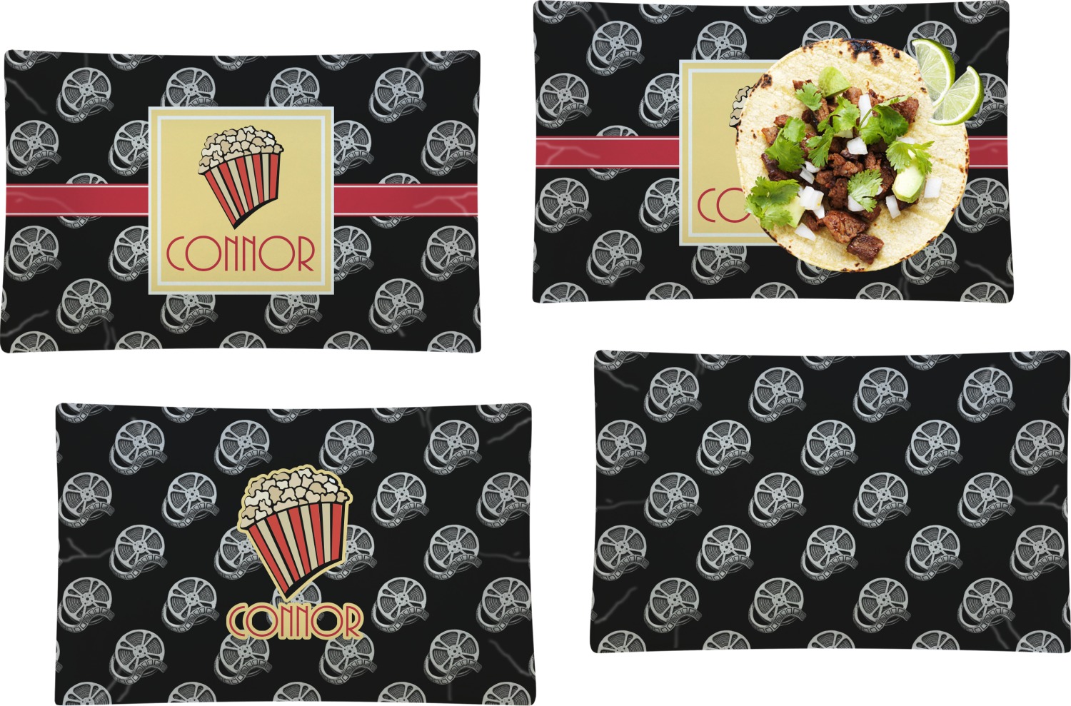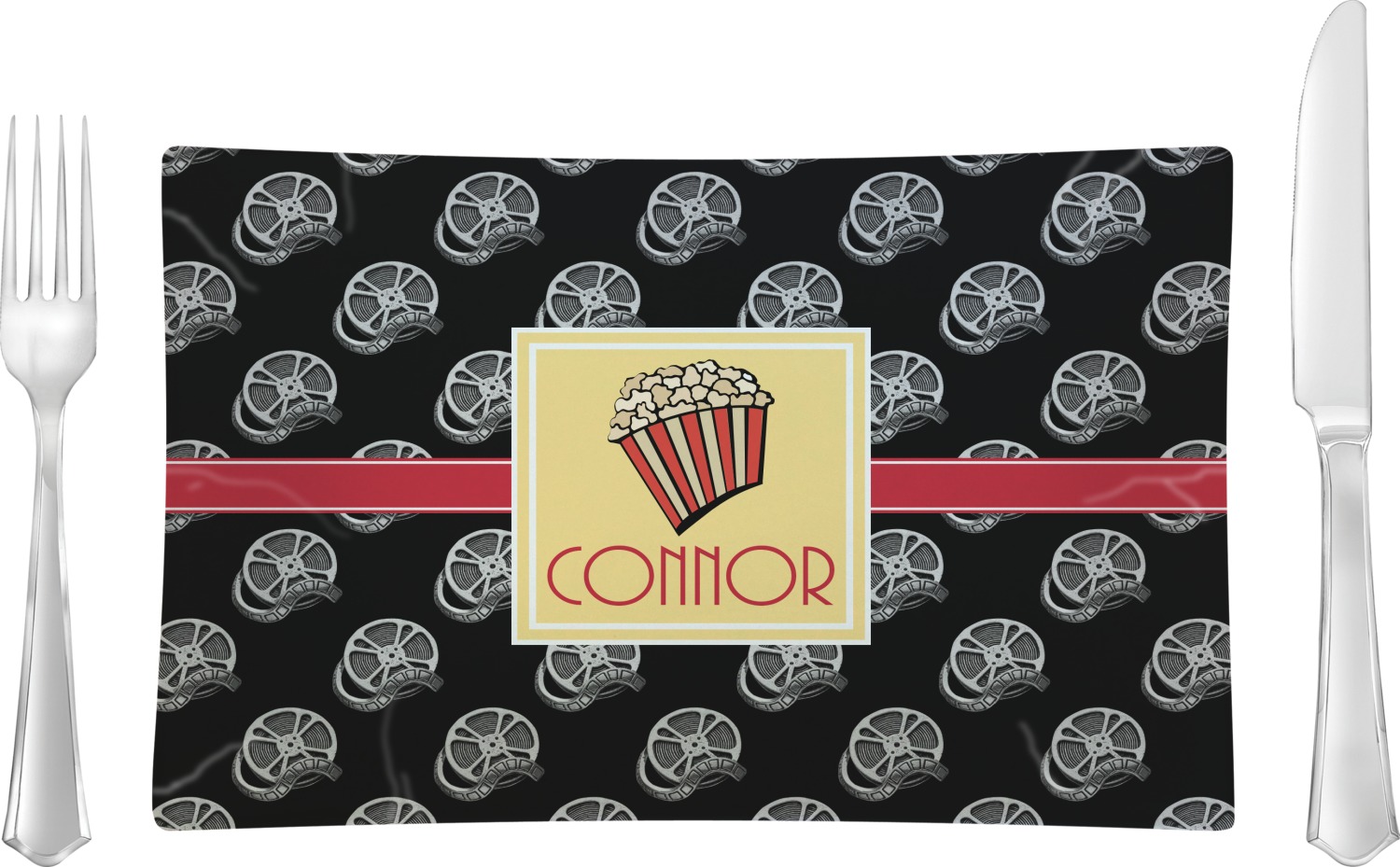This fun design features a black background with movie reels repeating. On top there is a bright red ribbon with a soft yellow frame. In the frame there is a fun popcorn graphic with your personalization underneath. The yellow and red give the perfect contrast against the dark black. The font even gives you a classic movie feel.