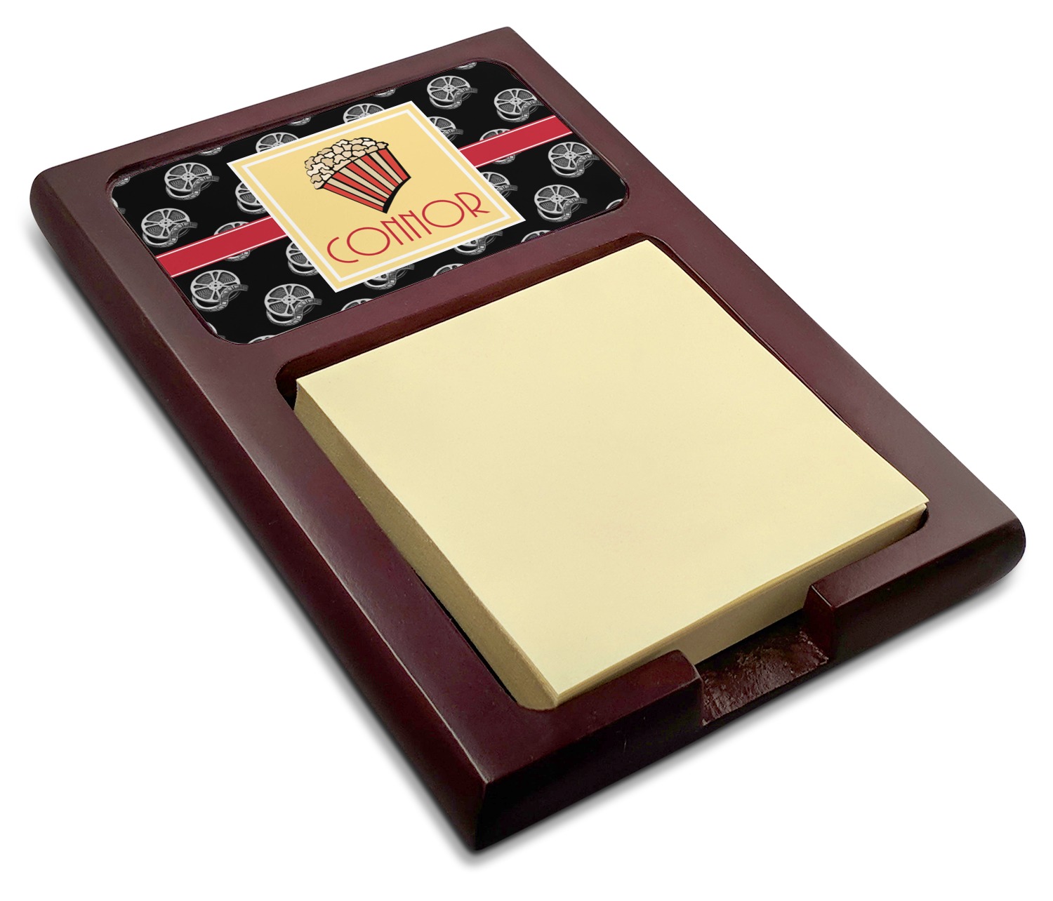 Crafted from a fine mahogany, this post it note holder is in the shade of a dark, cherry color. The dispenser itself is about 4.25 by 6.25 by 0.75 inches. You can place your 3 by 3 inch sticky notes in the indentation below the nameplate. We print your customization onto the nameplate that rests above the velvety indentation.