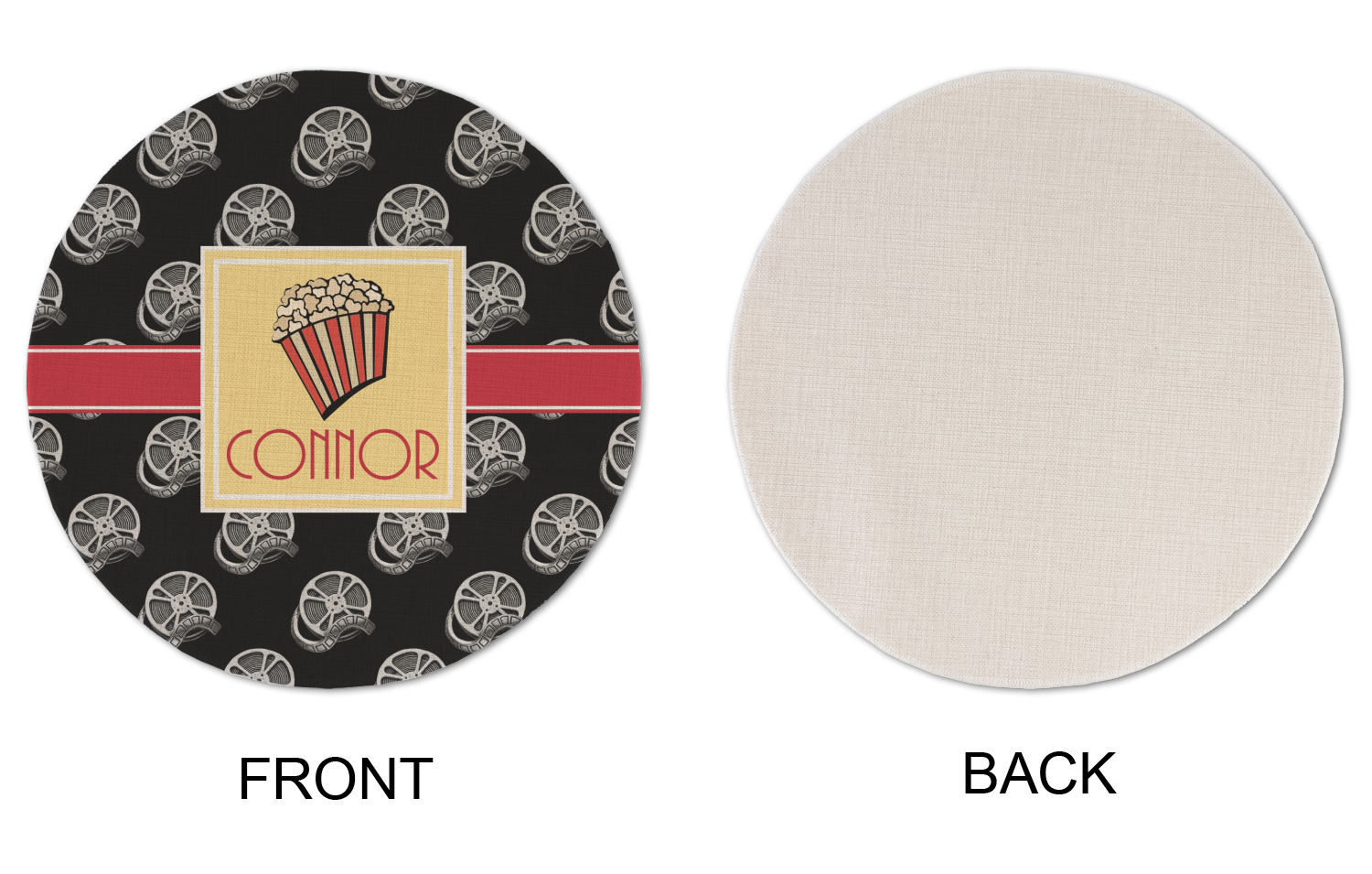 This fun design features a black background with movie reels repeating. On top there is a bright red ribbon with a soft yellow frame. In the frame there is a fun popcorn graphic with your personalization underneath. The yellow and red give the perfect contrast against the dark black. The font even gives you a classic movie feel.
