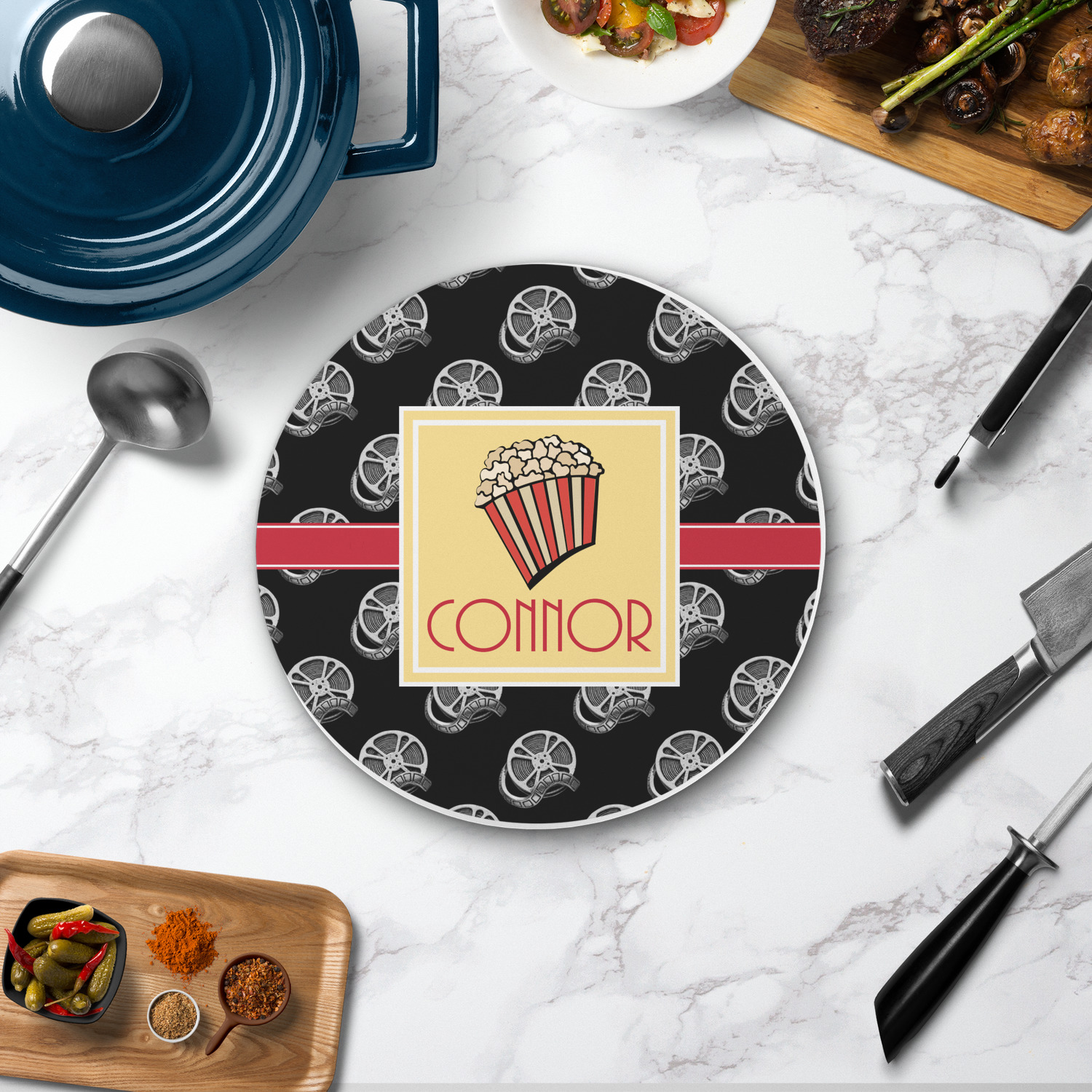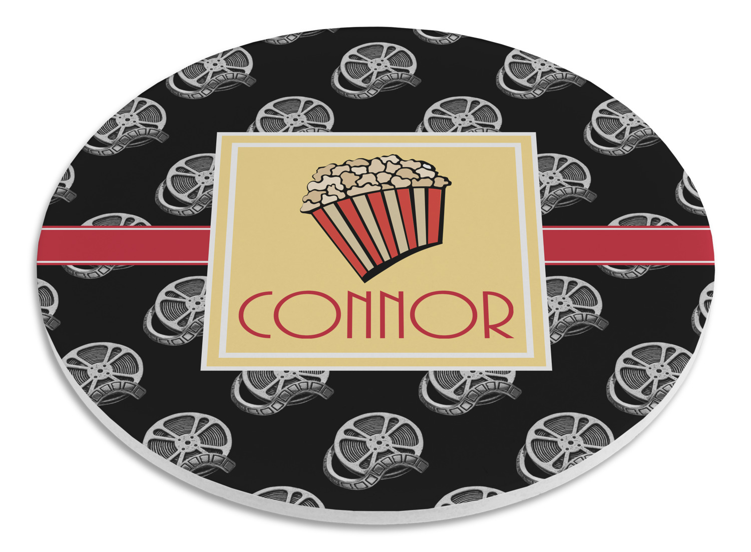 This fun design features a black background with movie reels repeating. On top there is a bright red ribbon with a soft yellow frame. In the frame there is a fun popcorn graphic with your personalization underneath. The yellow and red give the perfect contrast against the dark black. The font even gives you a classic movie feel.