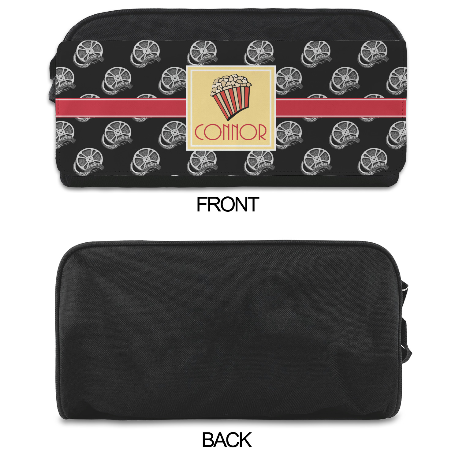 This fun design features a black background with movie reels repeating. On top there is a bright red ribbon with a soft yellow frame. In the frame there is a fun popcorn graphic with your personalization underneath. The yellow and red give the perfect contrast against the dark black. The font even gives you a classic movie feel.