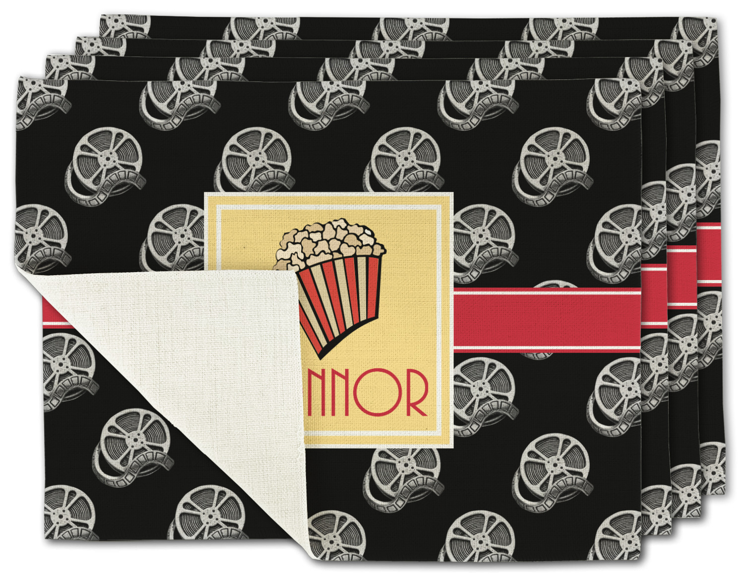 This fun design features a black background with movie reels repeating. On top there is a bright red ribbon with a soft yellow frame. In the frame there is a fun popcorn graphic with your personalization underneath. The yellow and red give the perfect contrast against the dark black. The font even gives you a classic movie feel.