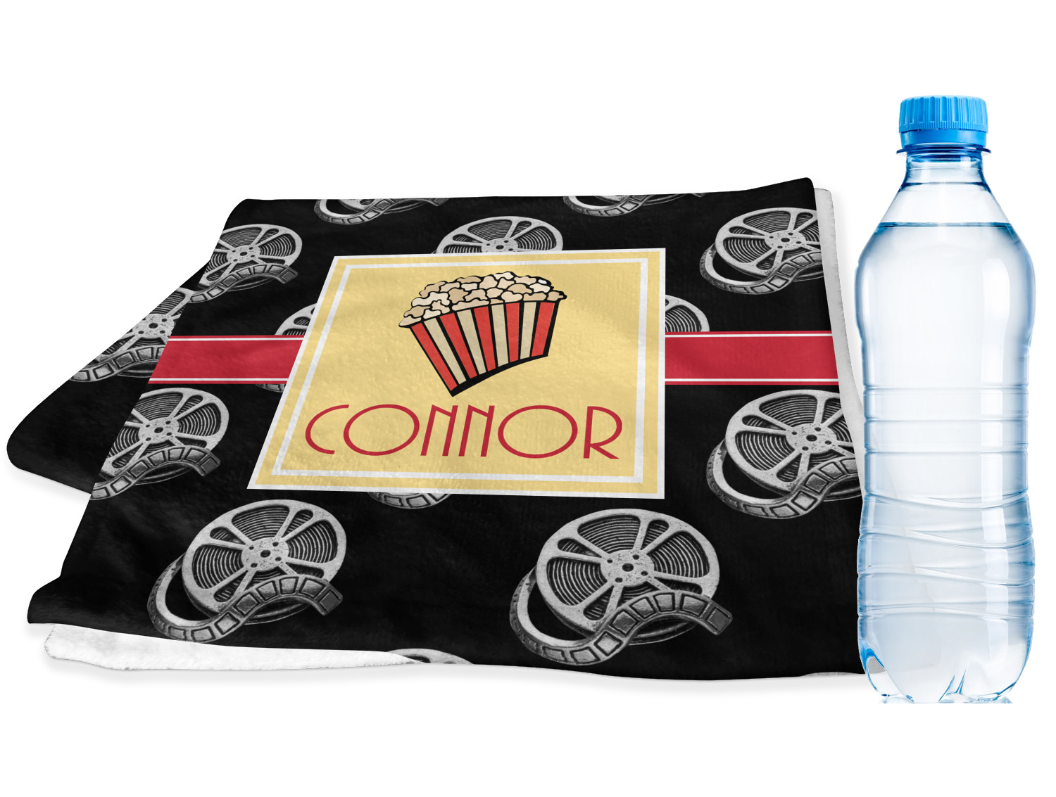 This fun design features a black background with movie reels repeating. On top there is a bright red ribbon with a soft yellow frame. In the frame there is a fun popcorn graphic with your personalization underneath. The yellow and red give the perfect contrast against the dark black. The font even gives you a classic movie feel.