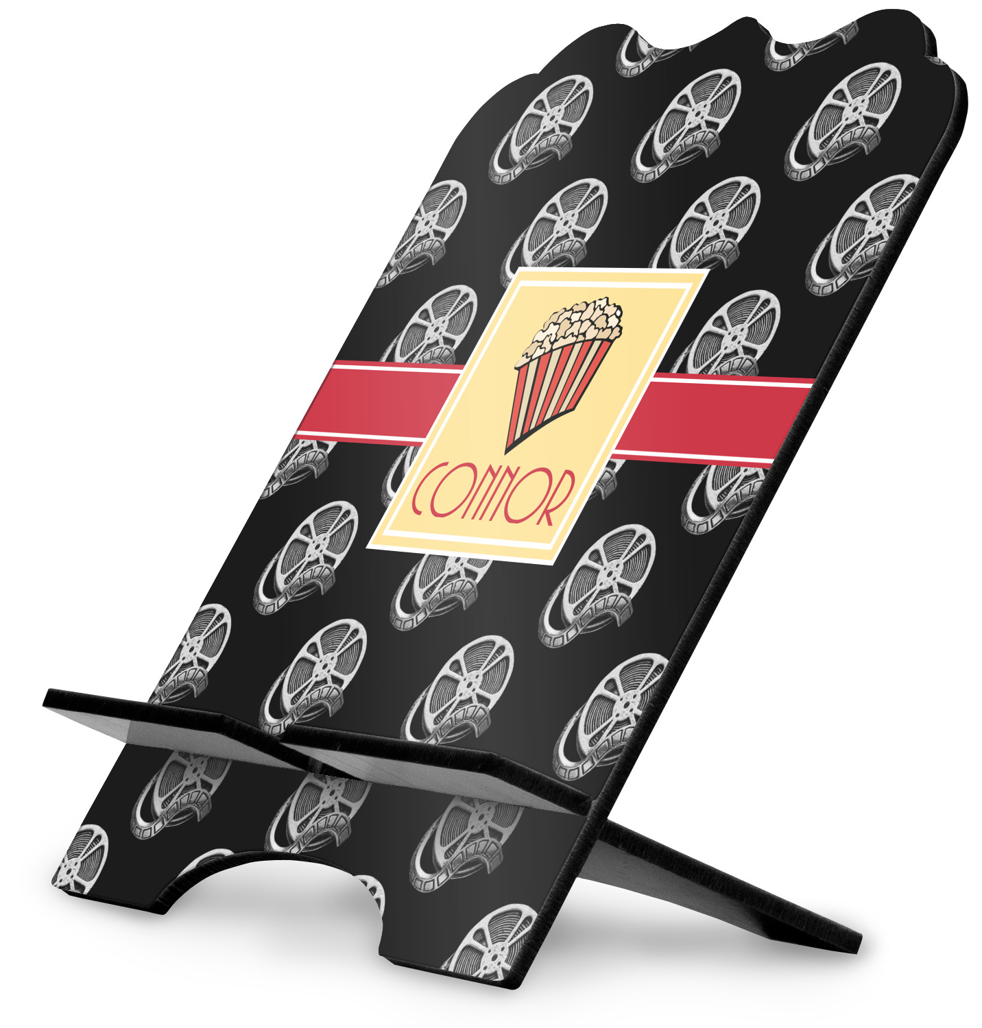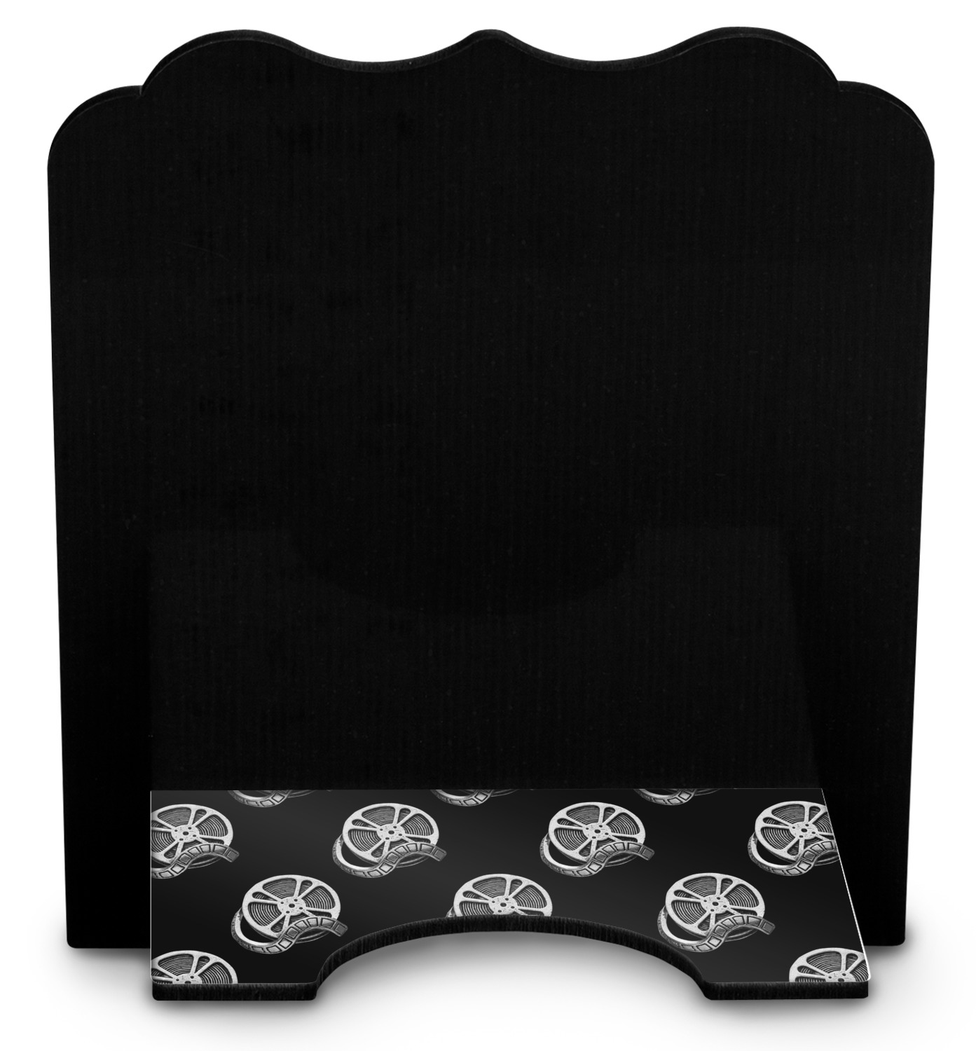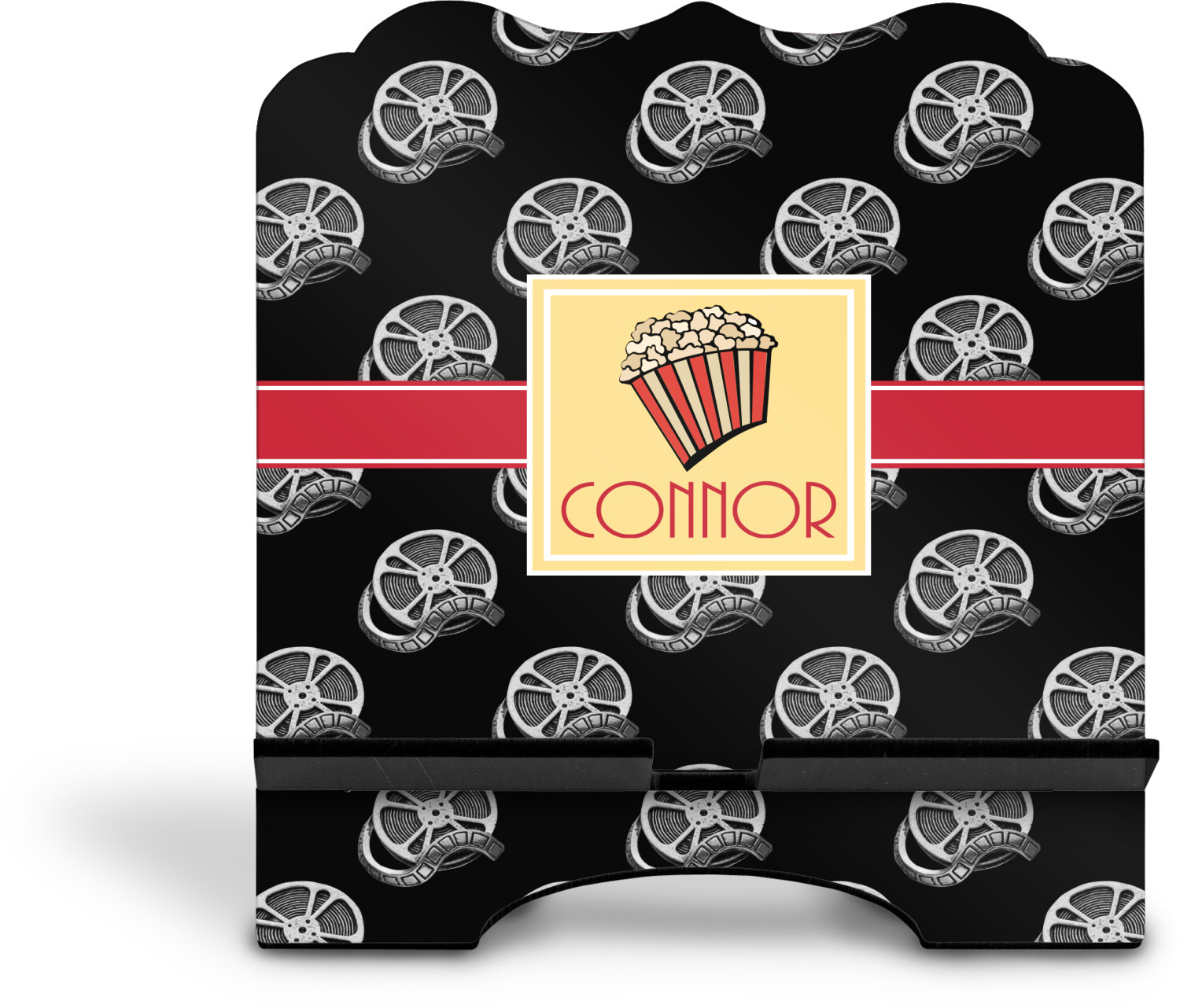This fun design features a black background with movie reels repeating. On top there is a bright red ribbon with a soft yellow frame. In the frame there is a fun popcorn graphic with your personalization underneath. The yellow and red give the perfect contrast against the dark black. The font even gives you a classic movie feel.