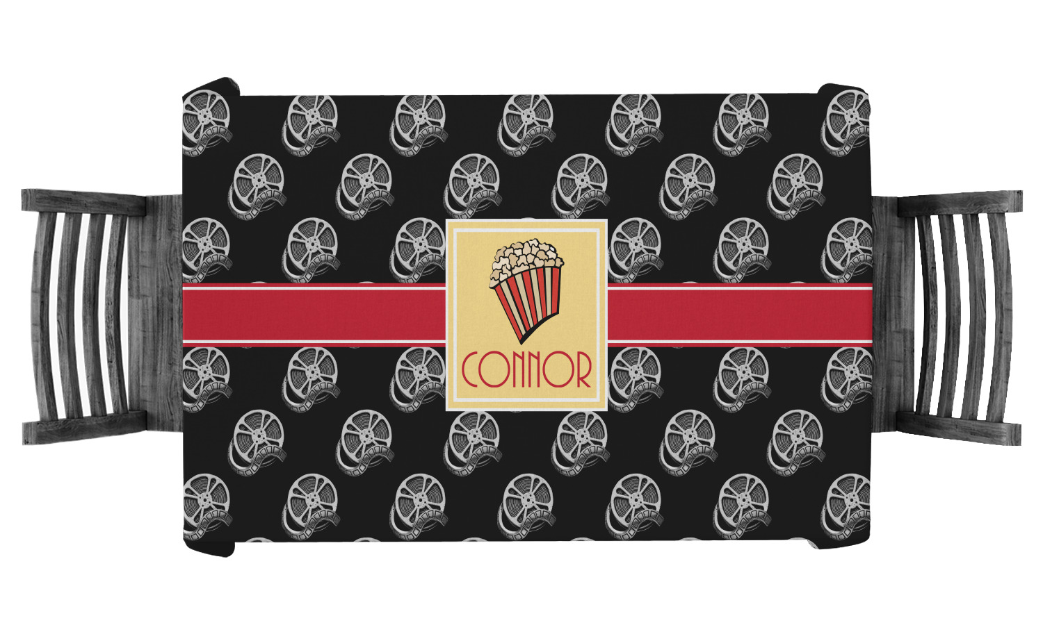 This fun design features a black background with movie reels repeating. On top there is a bright red ribbon with a soft yellow frame. In the frame there is a fun popcorn graphic with your personalization underneath. The yellow and red give the perfect contrast against the dark black. The font even gives you a classic movie feel.