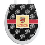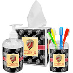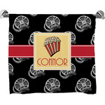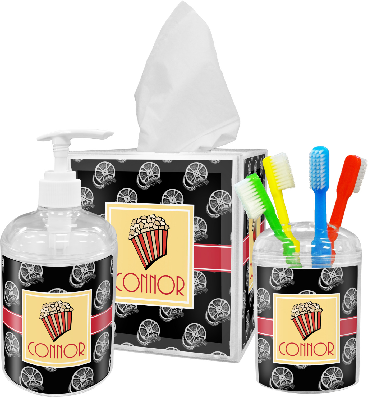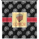 This fun design features a black background with movie reels repeating. On top there is a bright red ribbon with a soft yellow frame. In the frame there is a fun popcorn graphic with your personalization underneath. The yellow and red give the perfect contrast against the dark black. The font even gives you a classic movie feel.
