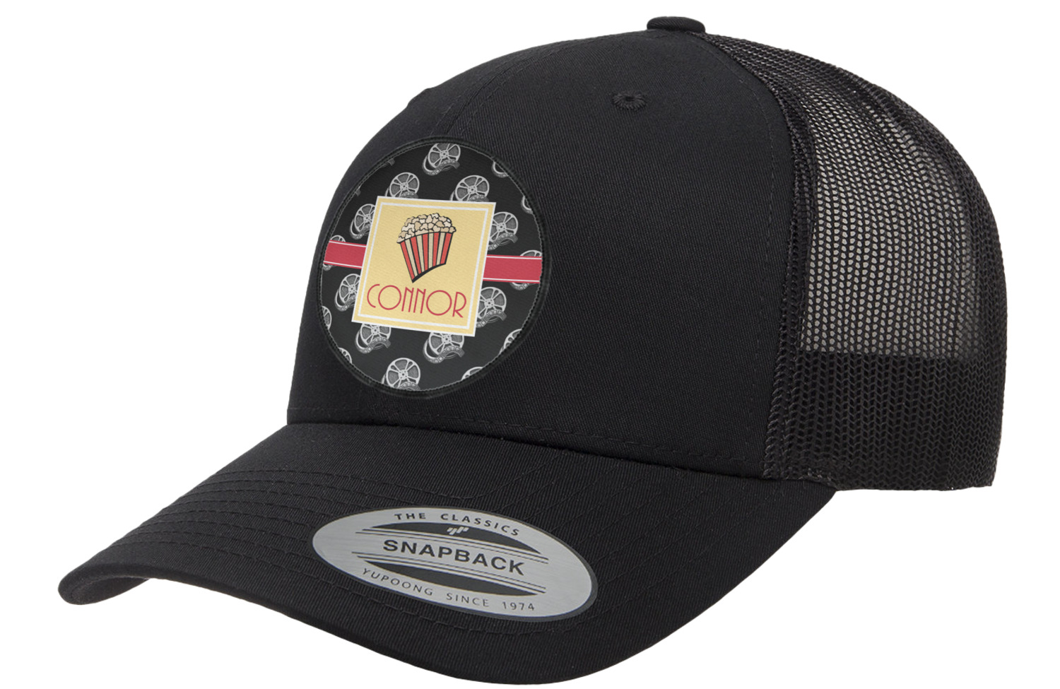 This fun design features a black background with movie reels repeating. On top there is a bright red ribbon with a soft yellow frame. In the frame there is a fun popcorn graphic with your personalization underneath. The yellow and red give the perfect contrast against the dark black. The font even gives you a classic movie feel.