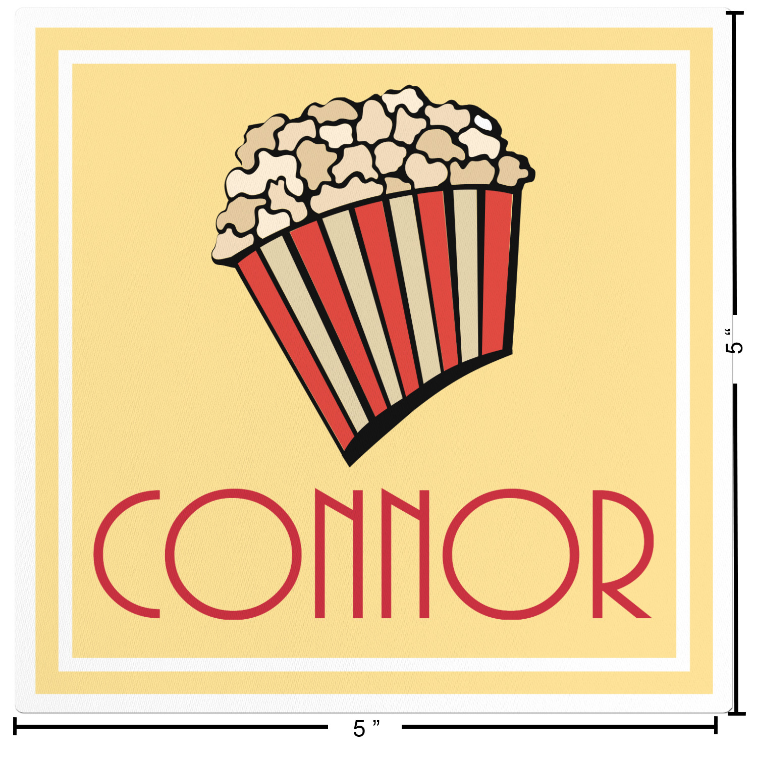 This fun design features a black background with movie reels repeating. On top there is a bright red ribbon with a soft yellow frame. In the frame there is a fun popcorn graphic with your personalization underneath. The yellow and red give the perfect contrast against the dark black. The font even gives you a classic movie feel.