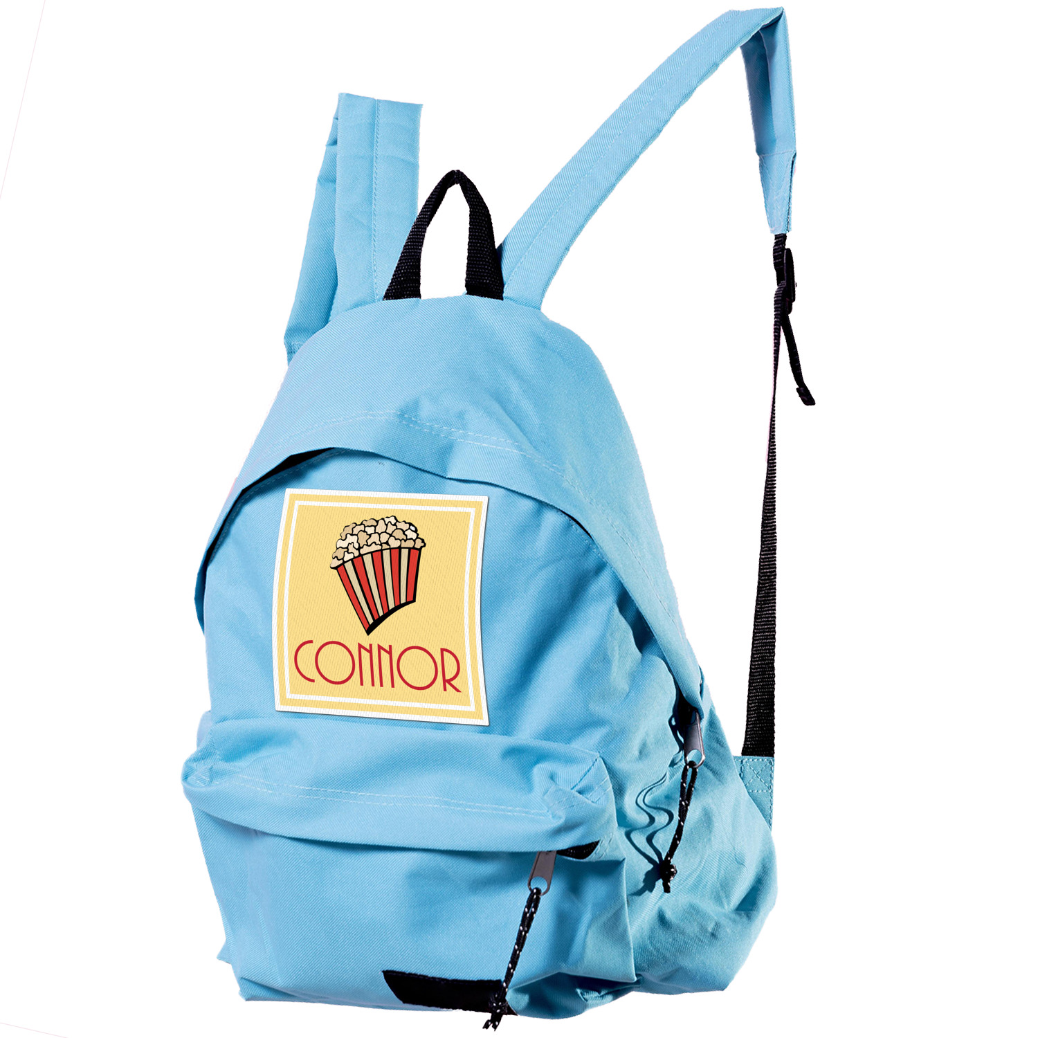 This fun design features a black background with movie reels repeating. On top there is a bright red ribbon with a soft yellow frame. In the frame there is a fun popcorn graphic with your personalization underneath. The yellow and red give the perfect contrast against the dark black. The font even gives you a classic movie feel.