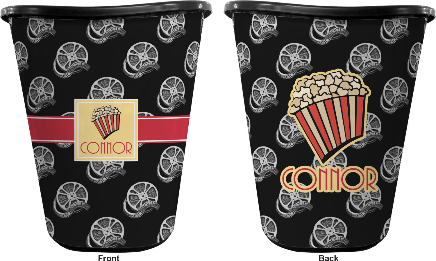 This fun design features a black background with movie reels repeating. On top there is a bright red ribbon with a soft yellow frame. In the frame there is a fun popcorn graphic with your personalization underneath. The yellow and red give the perfect contrast against the dark black. The font even gives you a classic movie feel.