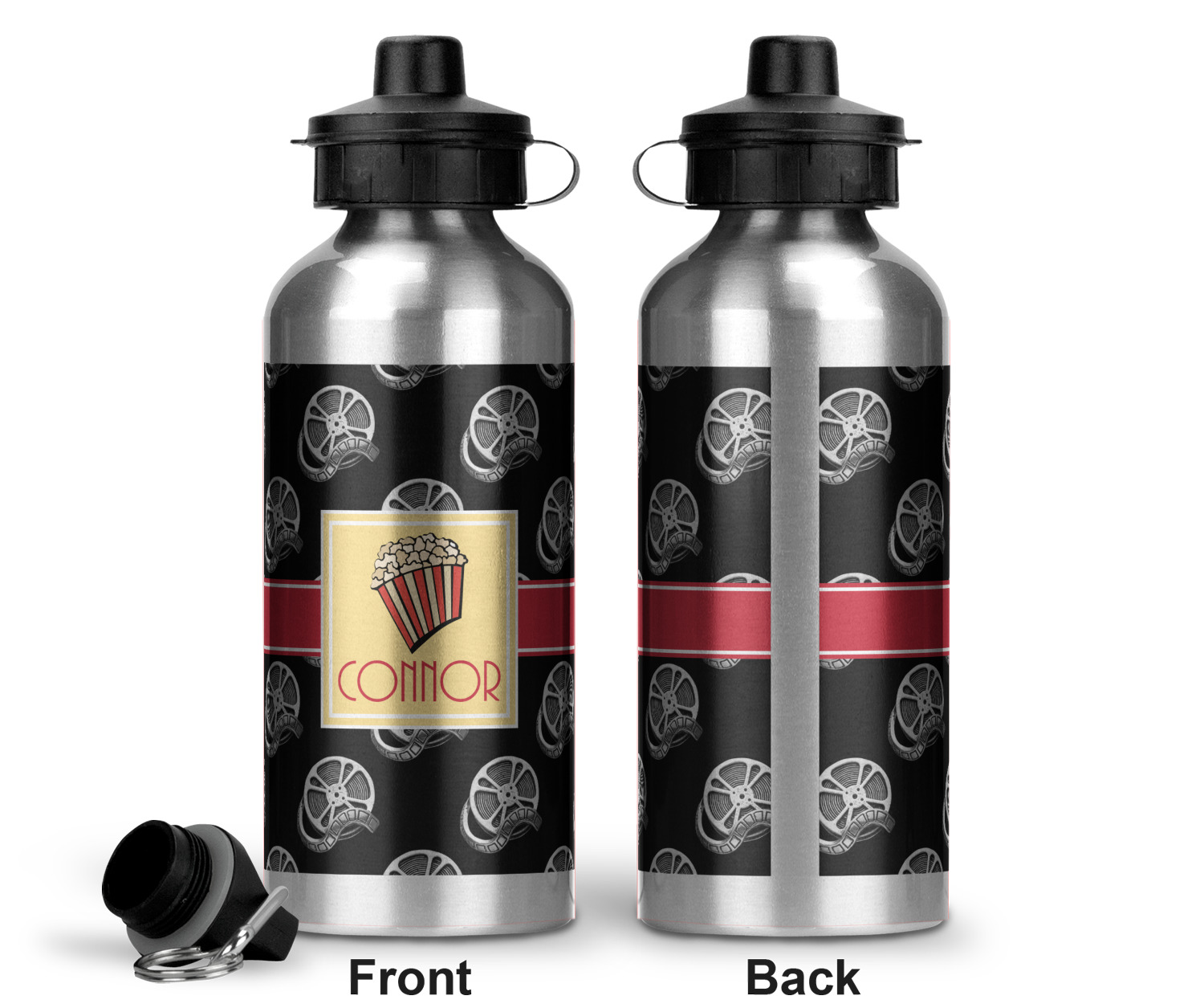 This fun design features a black background with movie reels repeating. On top there is a bright red ribbon with a soft yellow frame. In the frame there is a fun popcorn graphic with your personalization underneath. The yellow and red give the perfect contrast against the dark black. The font even gives you a classic movie feel.