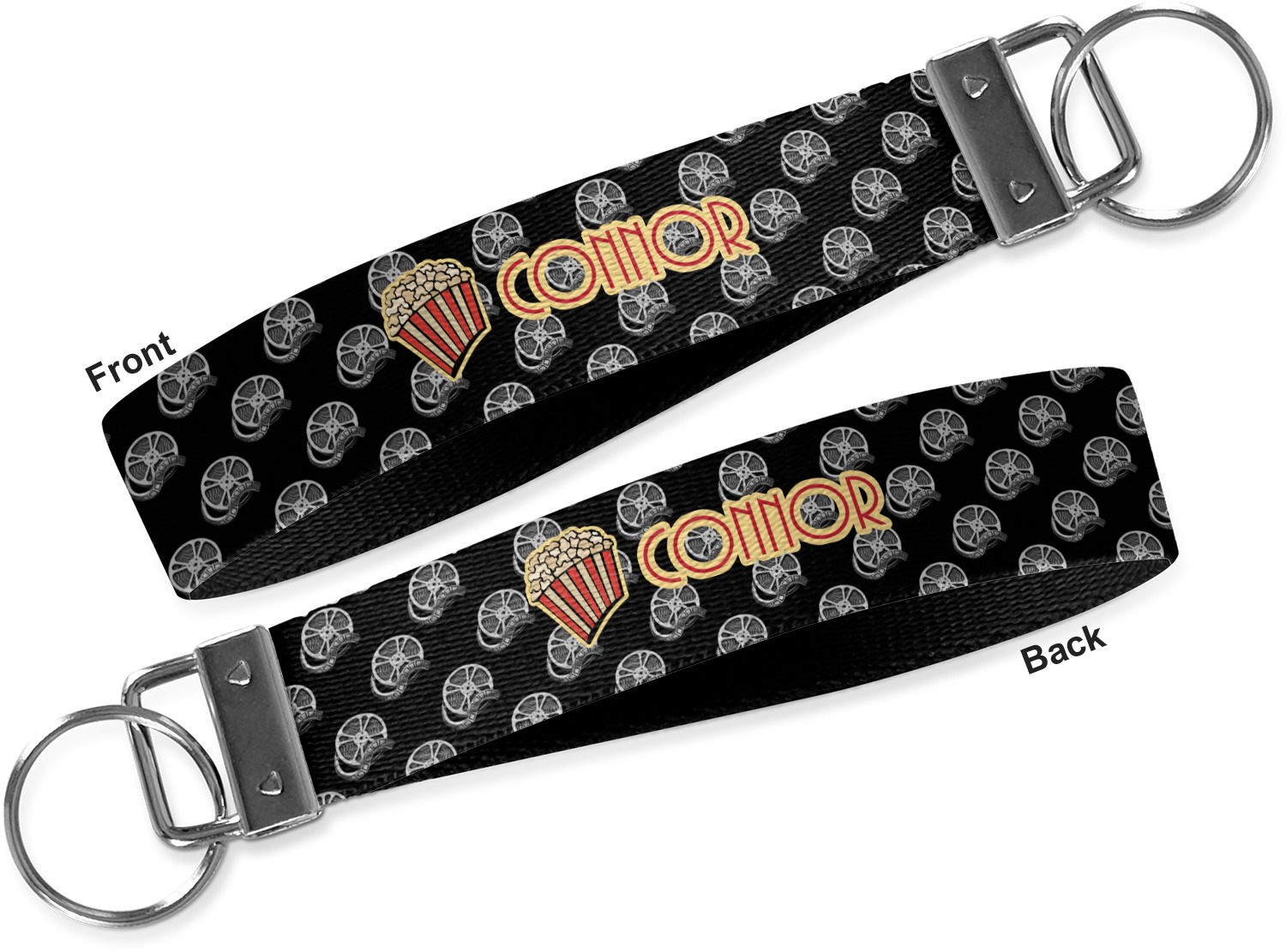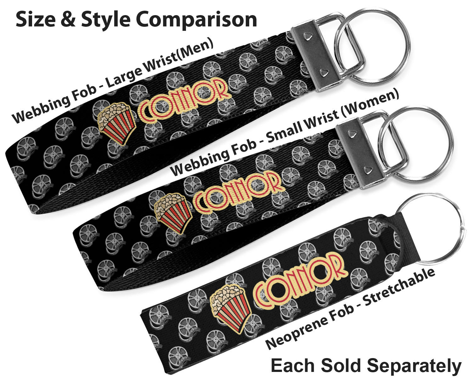 These key fob keychains are made from a polyester weave, right here in the USA. They feature a silver, metal clasp, attached to a round keyring. The piece gives the personalized wristlet a beautiful, finished look. Your customized design is printed on the outside of the keychain strap. We carry these wristlets in two sizes: small, which is 5 inches in width, and large, which is 5.5 inches in width.