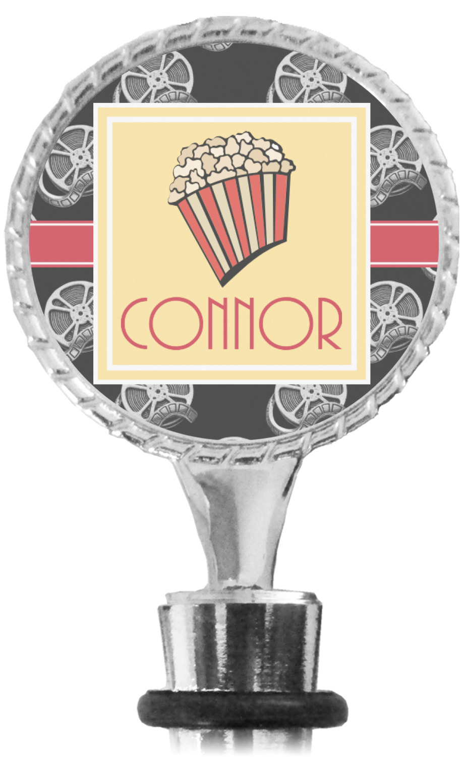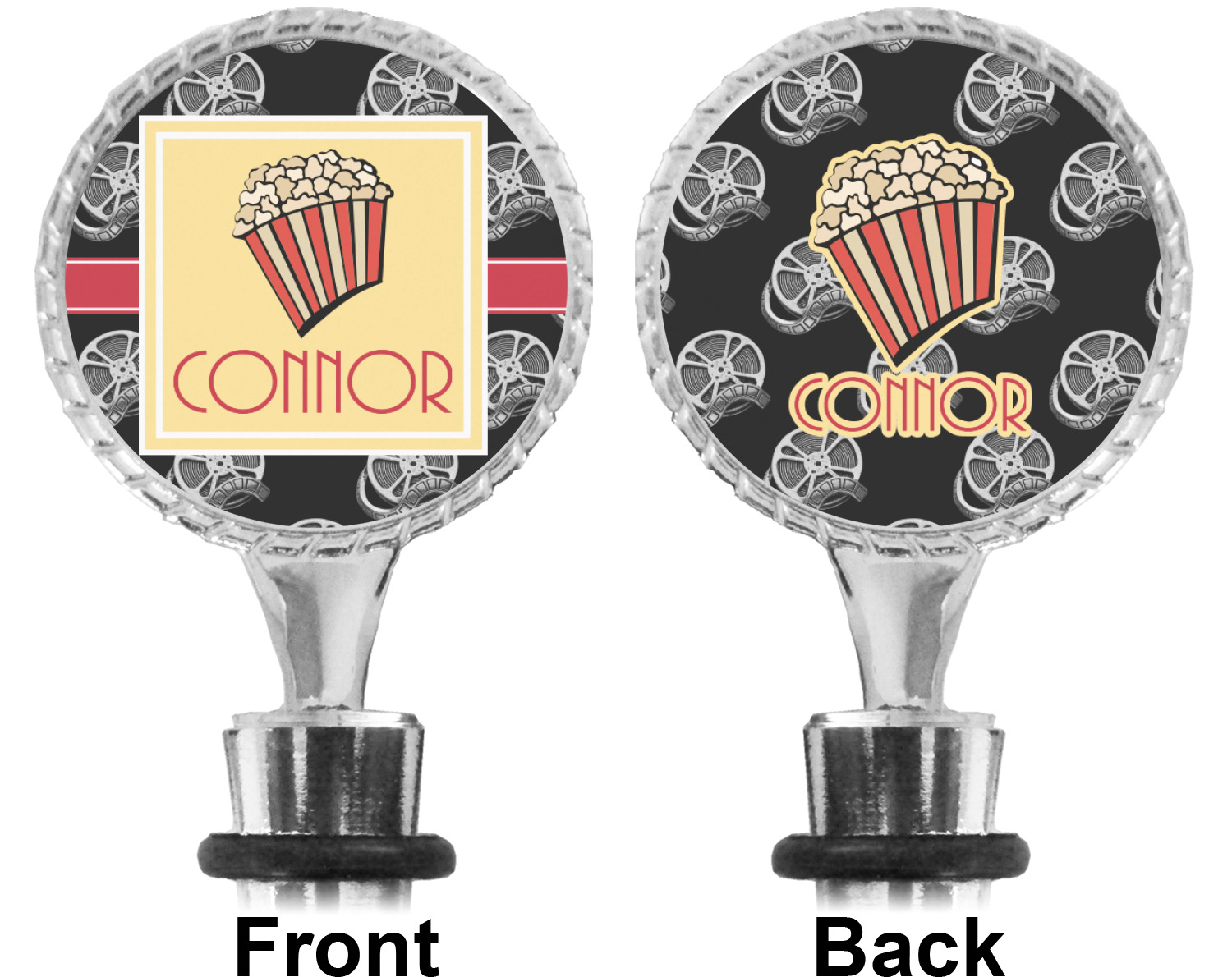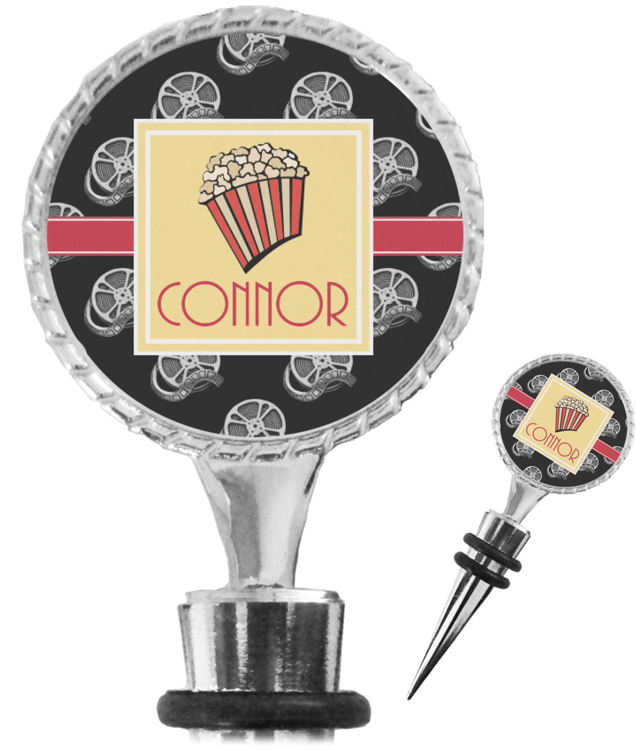 The top part of your bottle stopper is comprised of a zinc ring that displays your customization(s) in its middle, on both sides. The ring is heavy duty, with a bright chrome finish. The body of the wine stoppers have two silicone rings to provide an airtight seal. These wine bottle stoppers measure at 1.625" L x 0.8125" W x 4.625" H; your custom wine stopper is meant to fit into most standard-sized wine bottles.