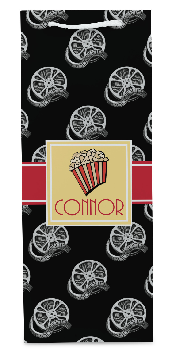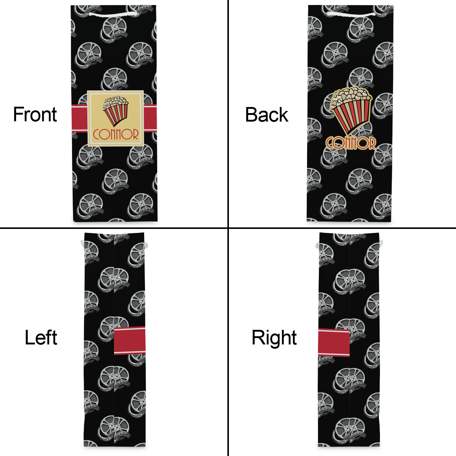 This fun design features a black background with movie reels repeating. On top there is a bright red ribbon with a soft yellow frame. In the frame there is a fun popcorn graphic with your personalization underneath. The yellow and red give the perfect contrast against the dark black. The font even gives you a classic movie feel.