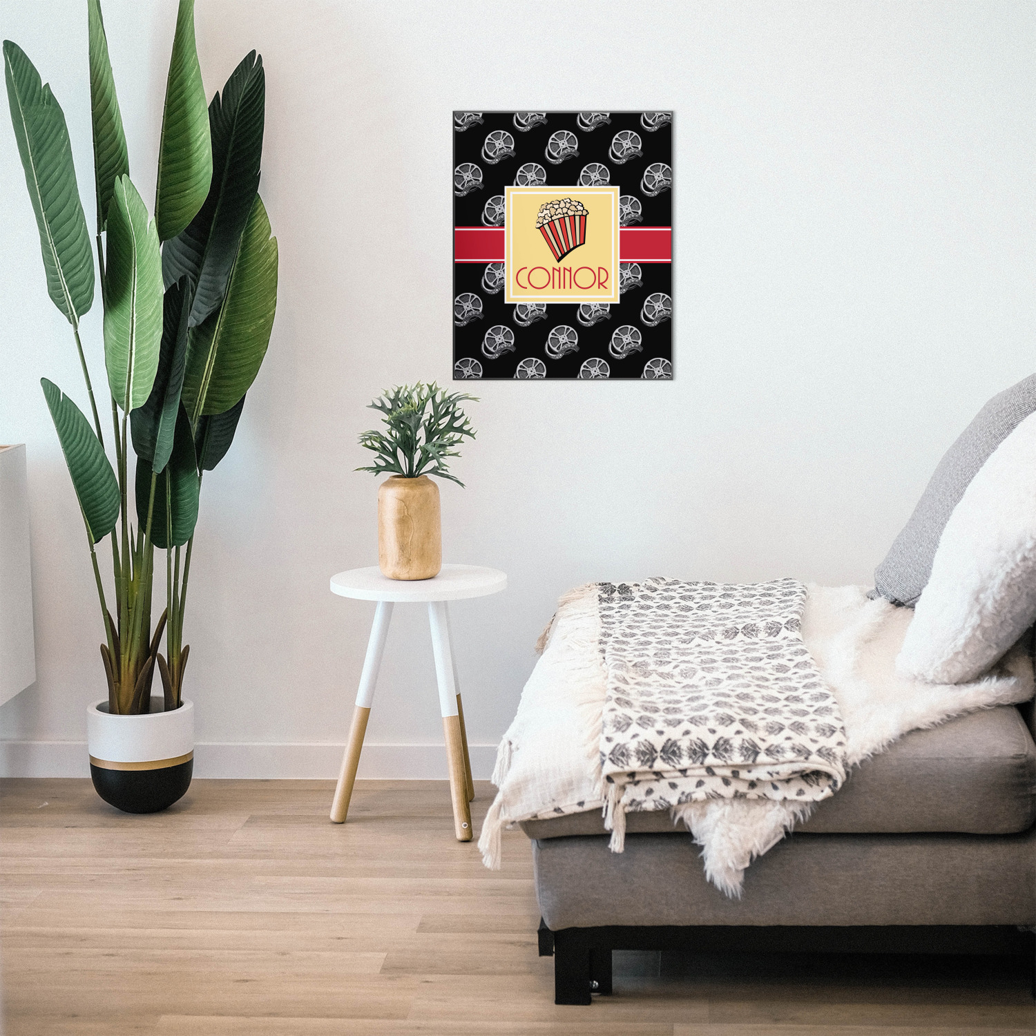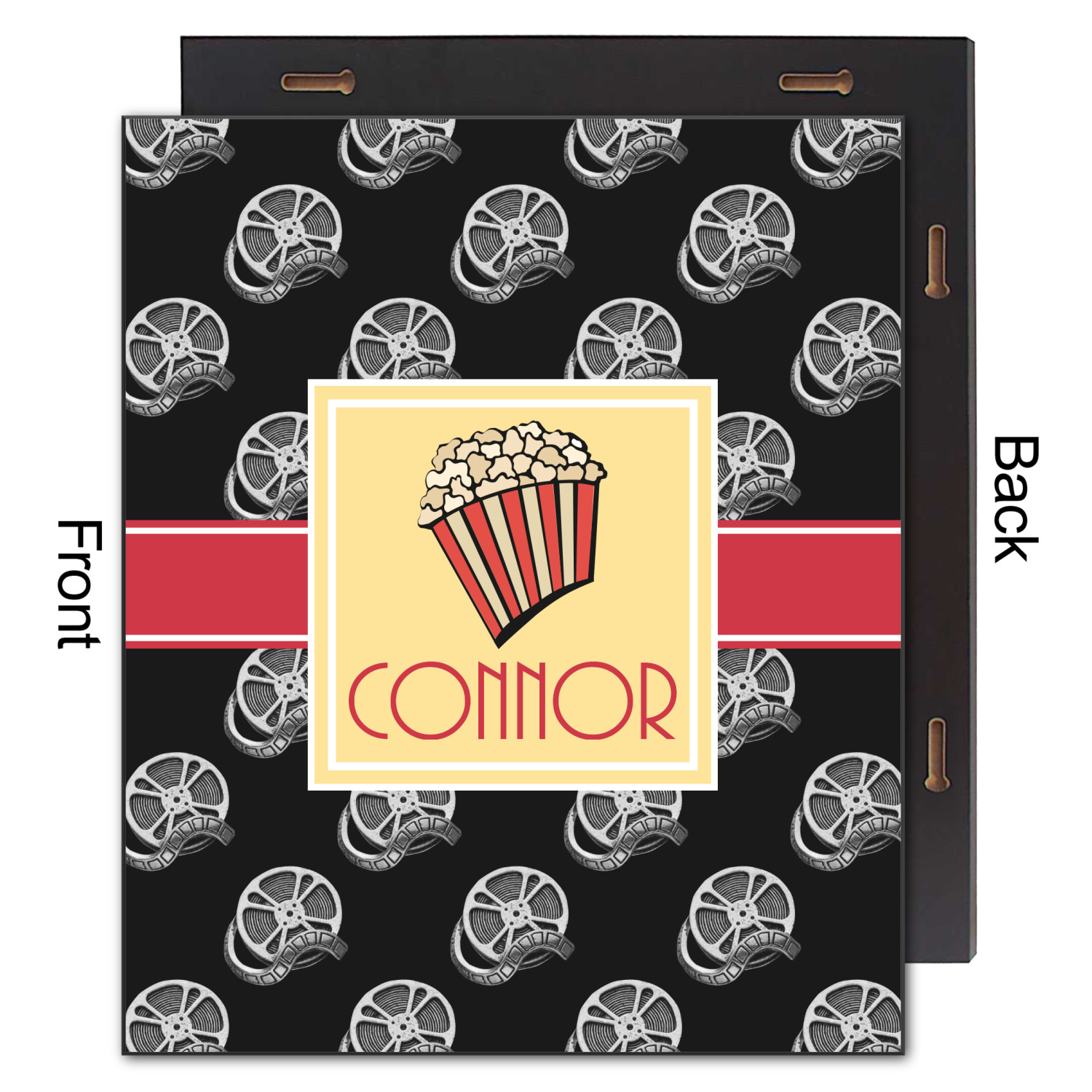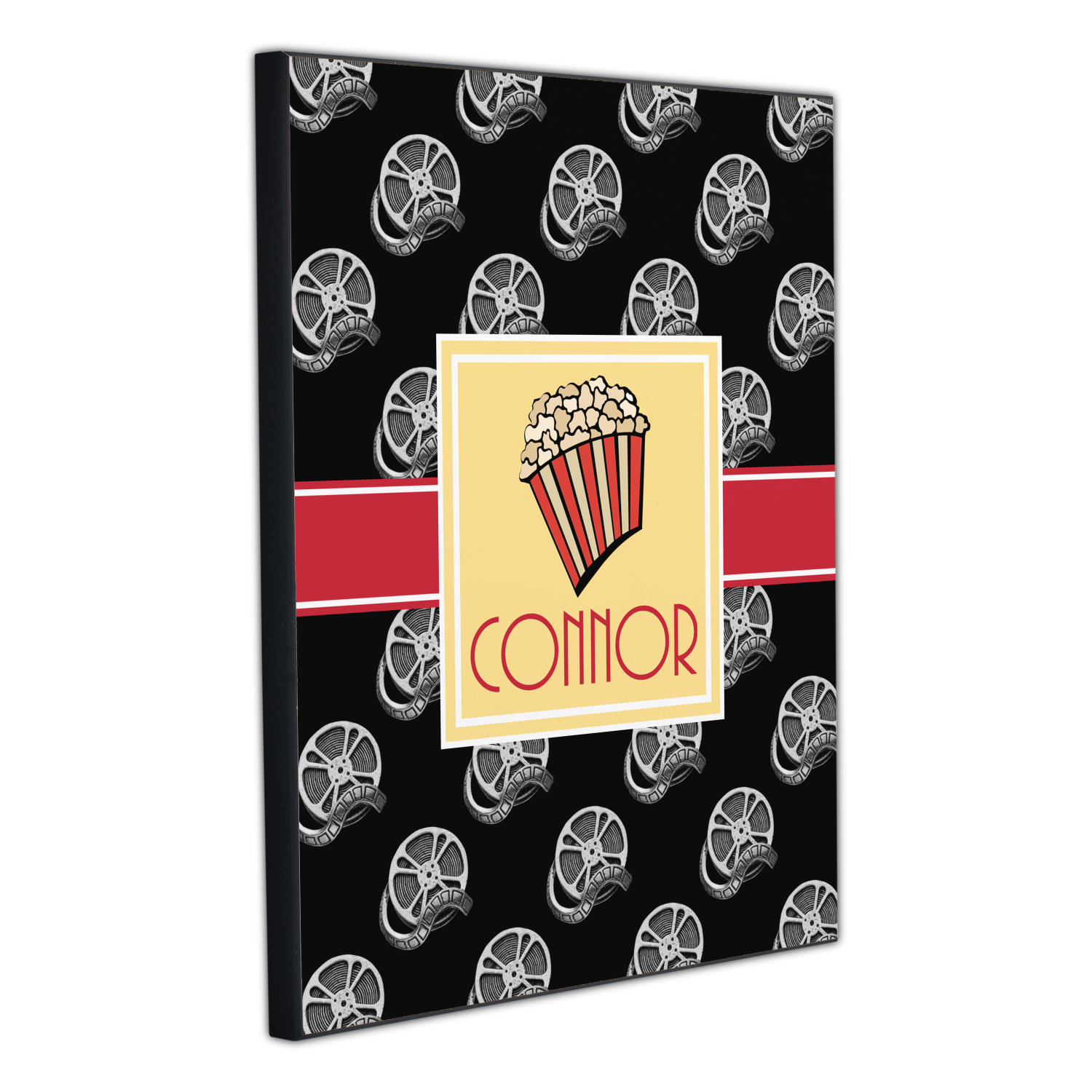 This fun design features a black background with movie reels repeating. On top there is a bright red ribbon with a soft yellow frame. In the frame there is a fun popcorn graphic with your personalization underneath. The yellow and red give the perfect contrast against the dark black. The font even gives you a classic movie feel.