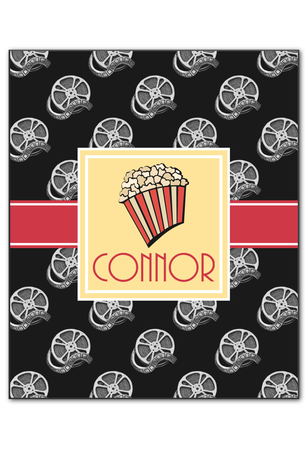 This fun design features a black background with movie reels repeating. On top there is a bright red ribbon with a soft yellow frame. In the frame there is a fun popcorn graphic with your personalization underneath. The yellow and red give the perfect contrast against the dark black. The font even gives you a classic movie feel.