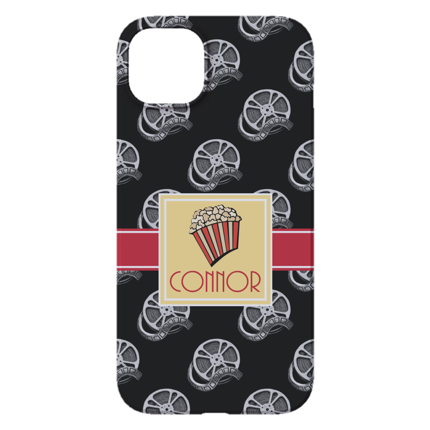 This fun design features a black background with movie reels repeating. On top there is a bright red ribbon with a soft yellow frame. In the frame there is a fun popcorn graphic with your personalization underneath. The yellow and red give the perfect contrast against the dark black. The font even gives you a classic movie feel.