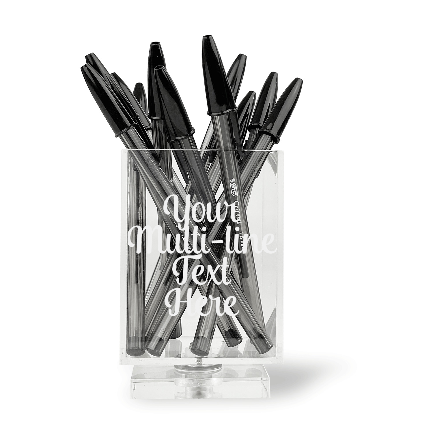 Add a great accessory to your desk with one of these acrylic pen holders. A great way to store your writing utensils, and personalized to suit your needs.