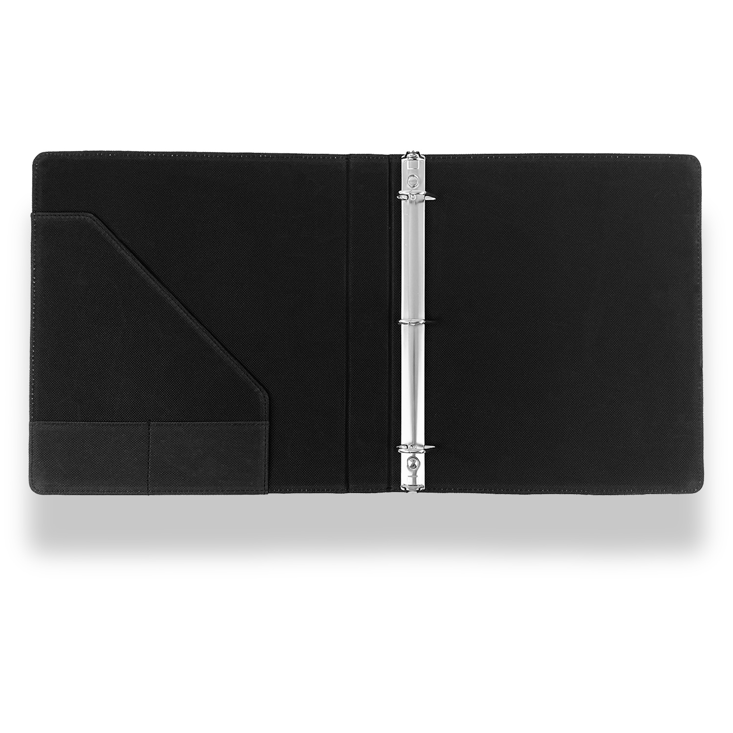 On the inside cover is a textured black tweed material. Inside the front cover there is a pocket for additional paper storage and two small pockets perfect for holding business cards.